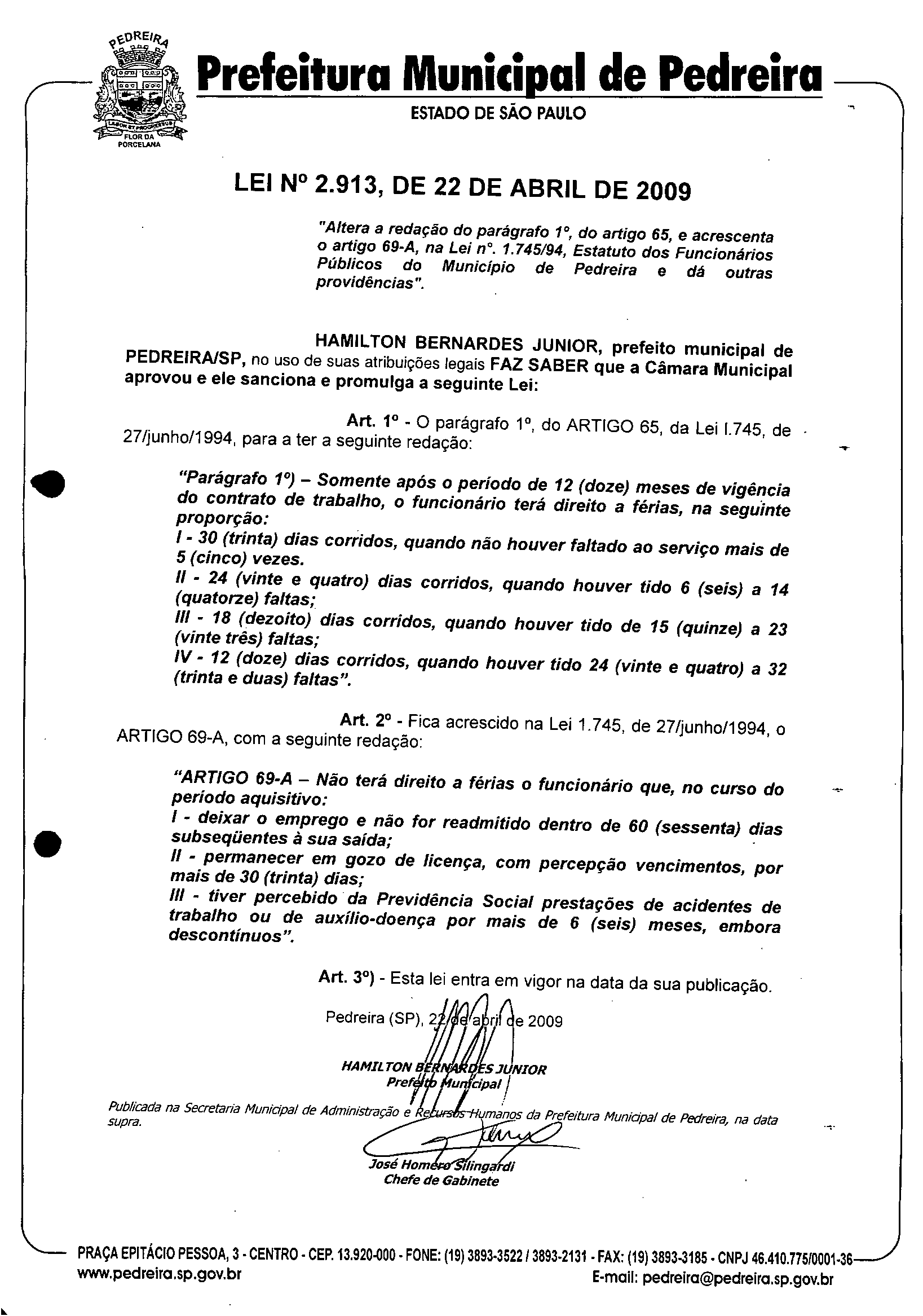 Ementa: "Altera a redação do parágrafo 1°, do artigo 65, e acrescenta o artigo 69-A, na Lei n°. 1.745/94, Estatuto dos Funcionários Públicos do Município de Pedreira e dá outras providências".