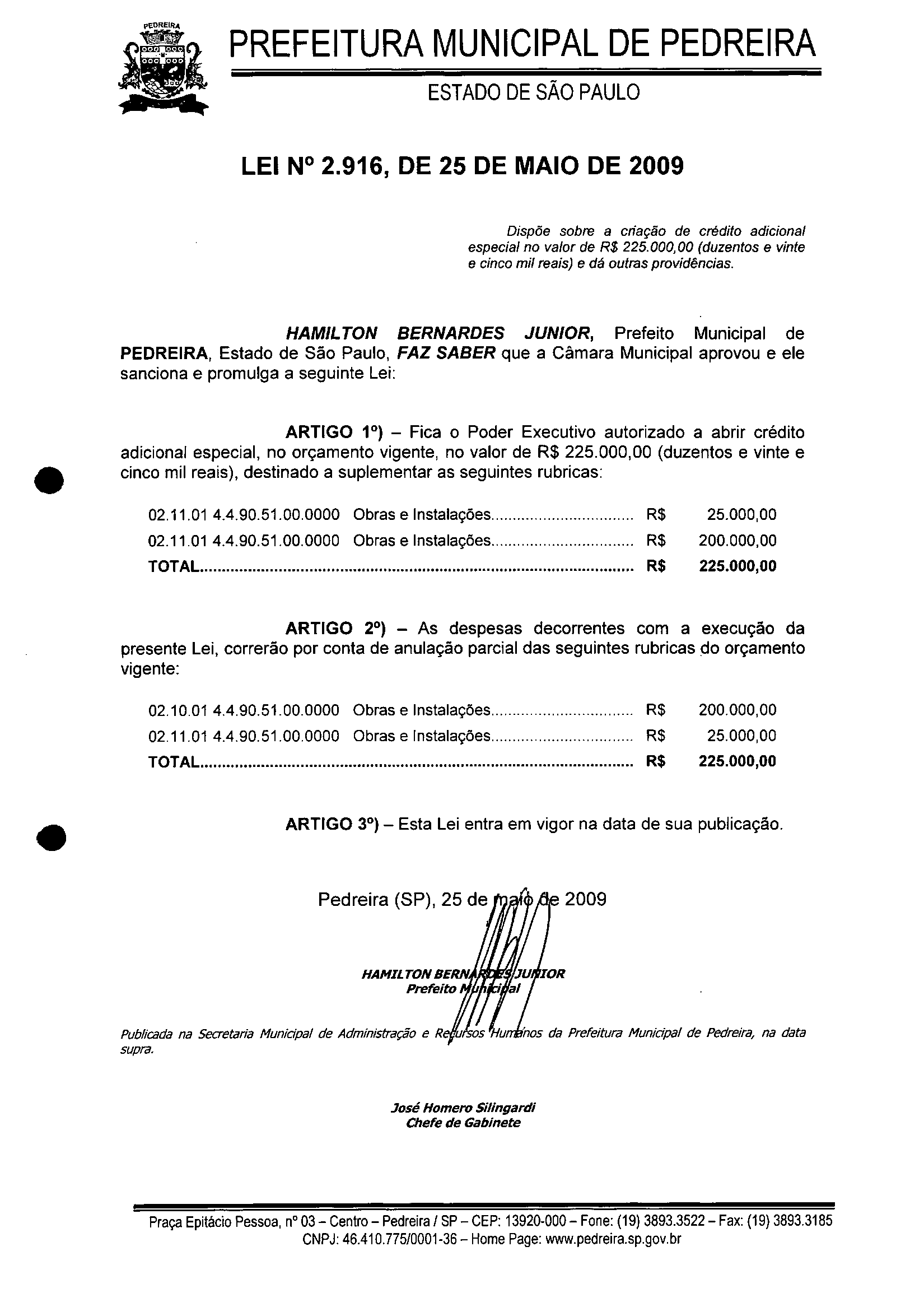 Ementa: Dispõe sobre a criação de crédito adicional especial no valor de R$ 225.000,00 (duzentos e vinte e cinco mil reais) e dá outras providências.