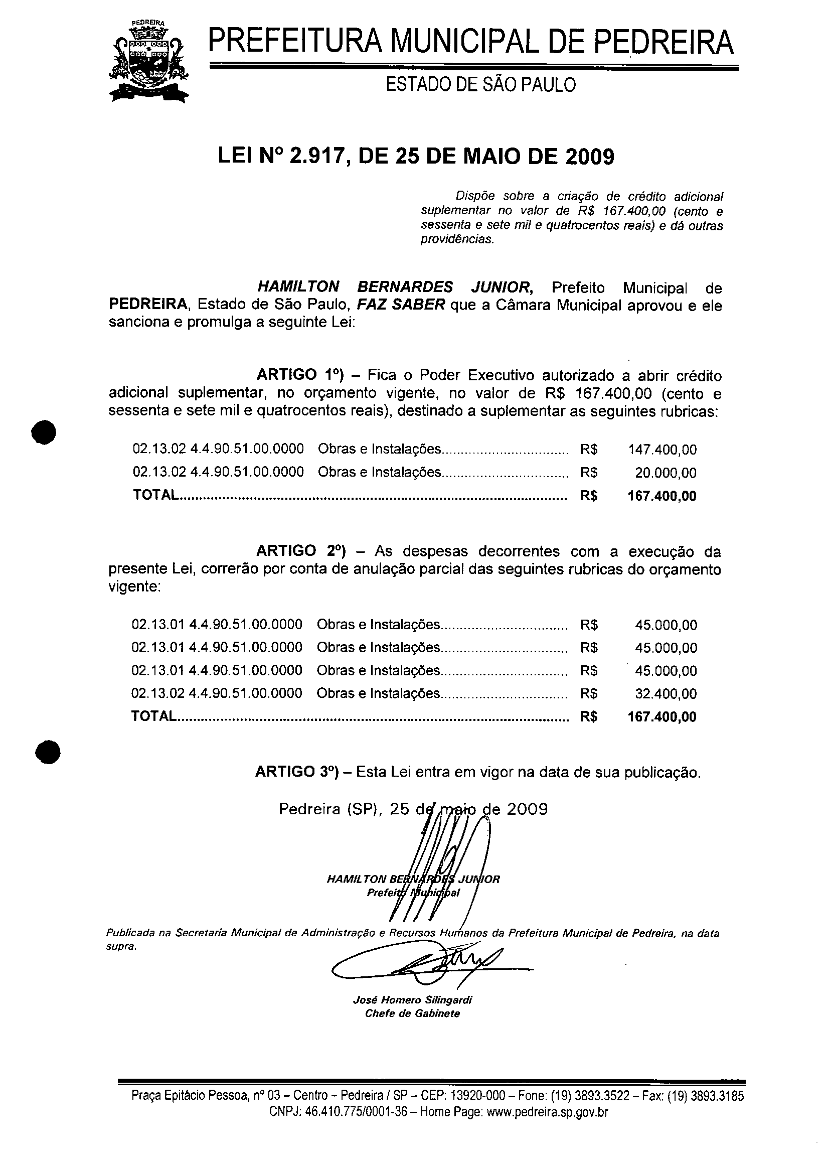 Lei Municipal - N° 2917 de 25/05/2009