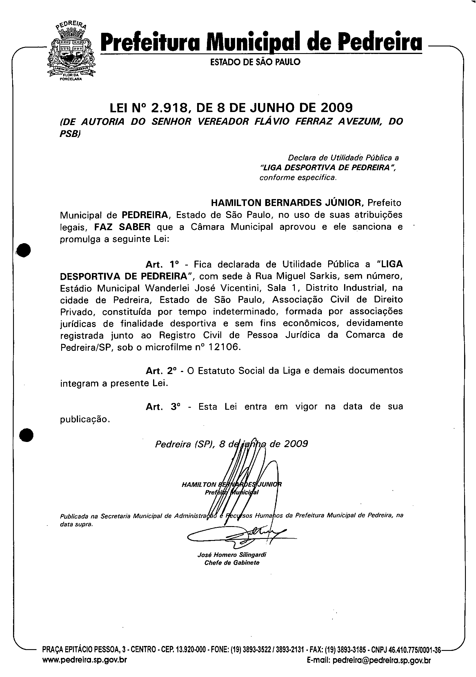 Lei Municipal - N° 2918 de 08/06/2009