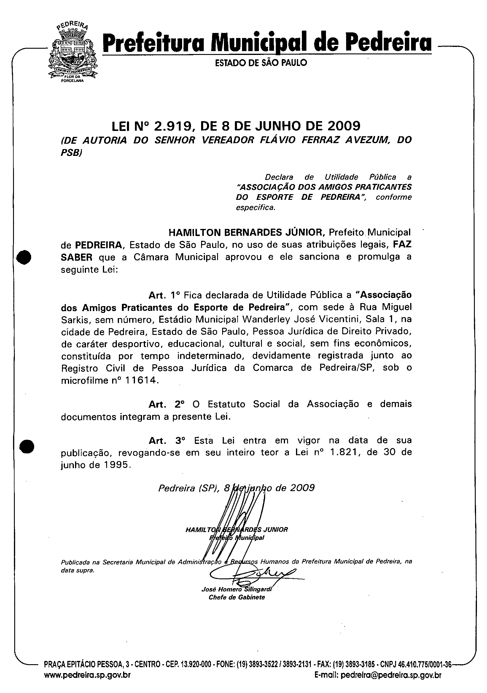 Lei Municipal - N° 2919 de 08/06/2009