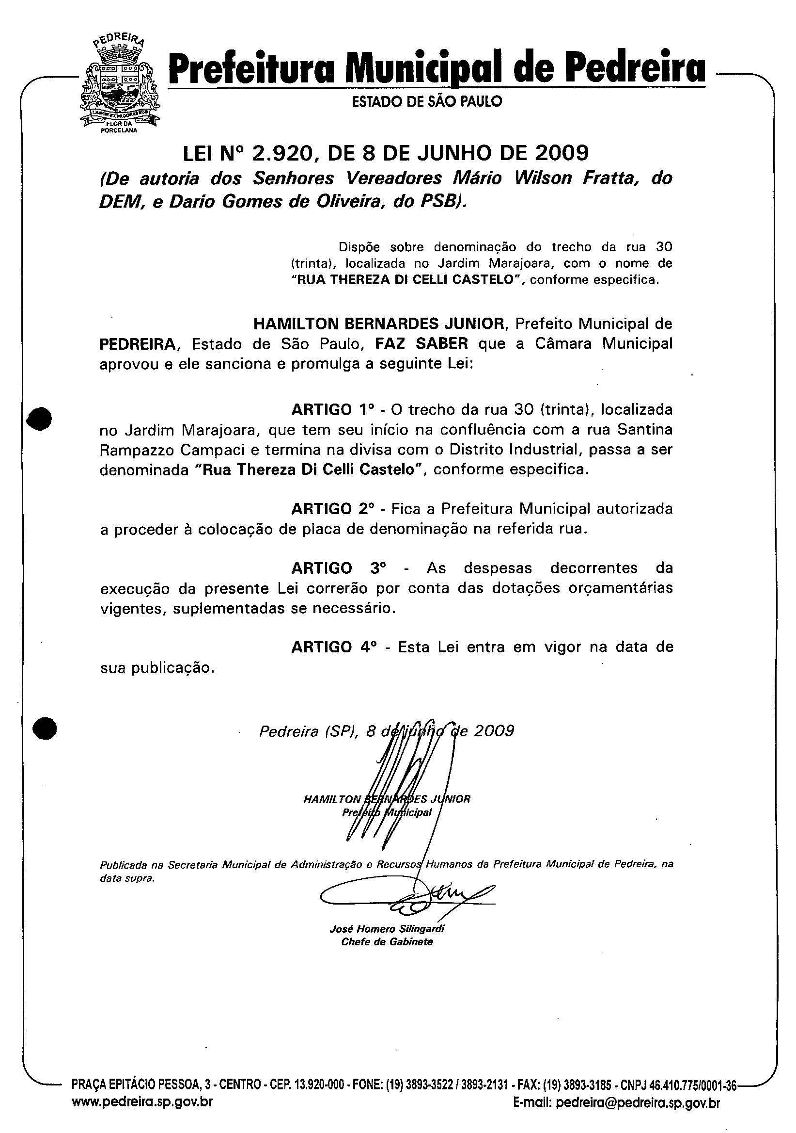 Lei Municipal - N° 2920 de 08/06/2009