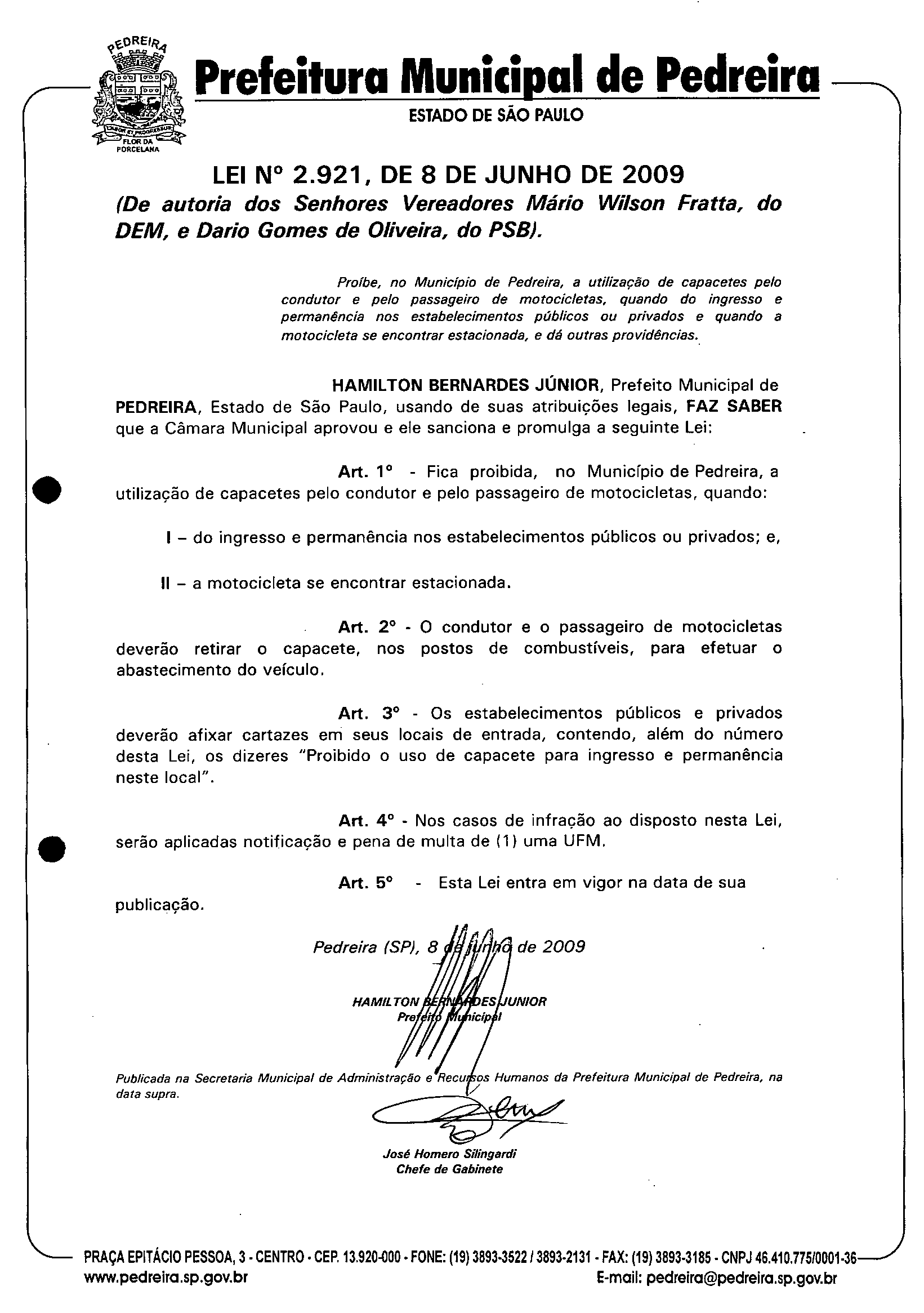 Ementa: Proíbe~ no Município de Pedreira, a utilização de capacetes pelo condutor e pelo passageiro de motocicletas, quando do ingresso e permanência nos estabelecimentos públicos ou privados e quando a motocicleta se encontrar estacionada, e dá outras providências.