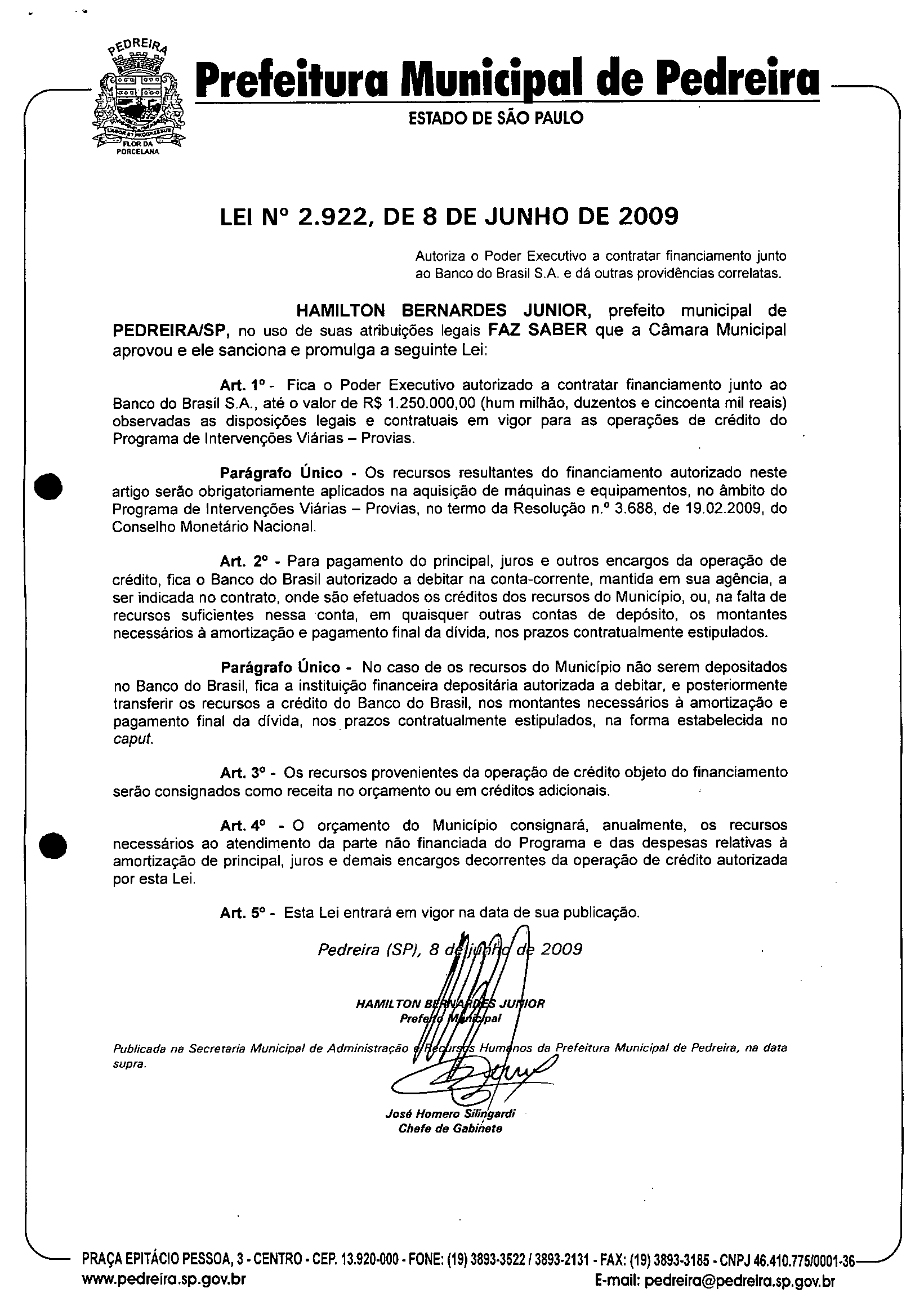 Lei Municipal - N° 2922 de 08/06/2009