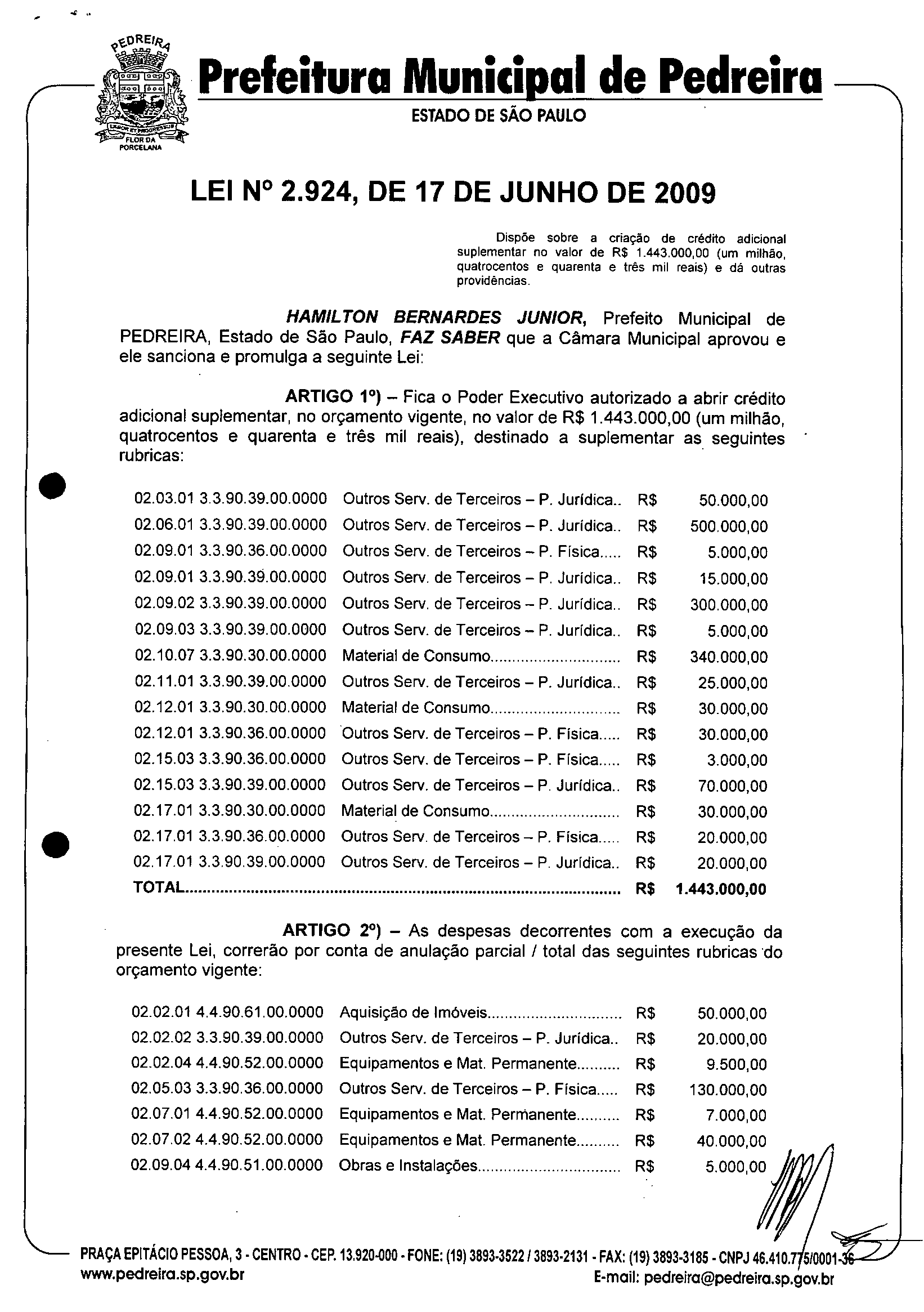 Lei Municipal - N° 2924 de 17/06/2009
