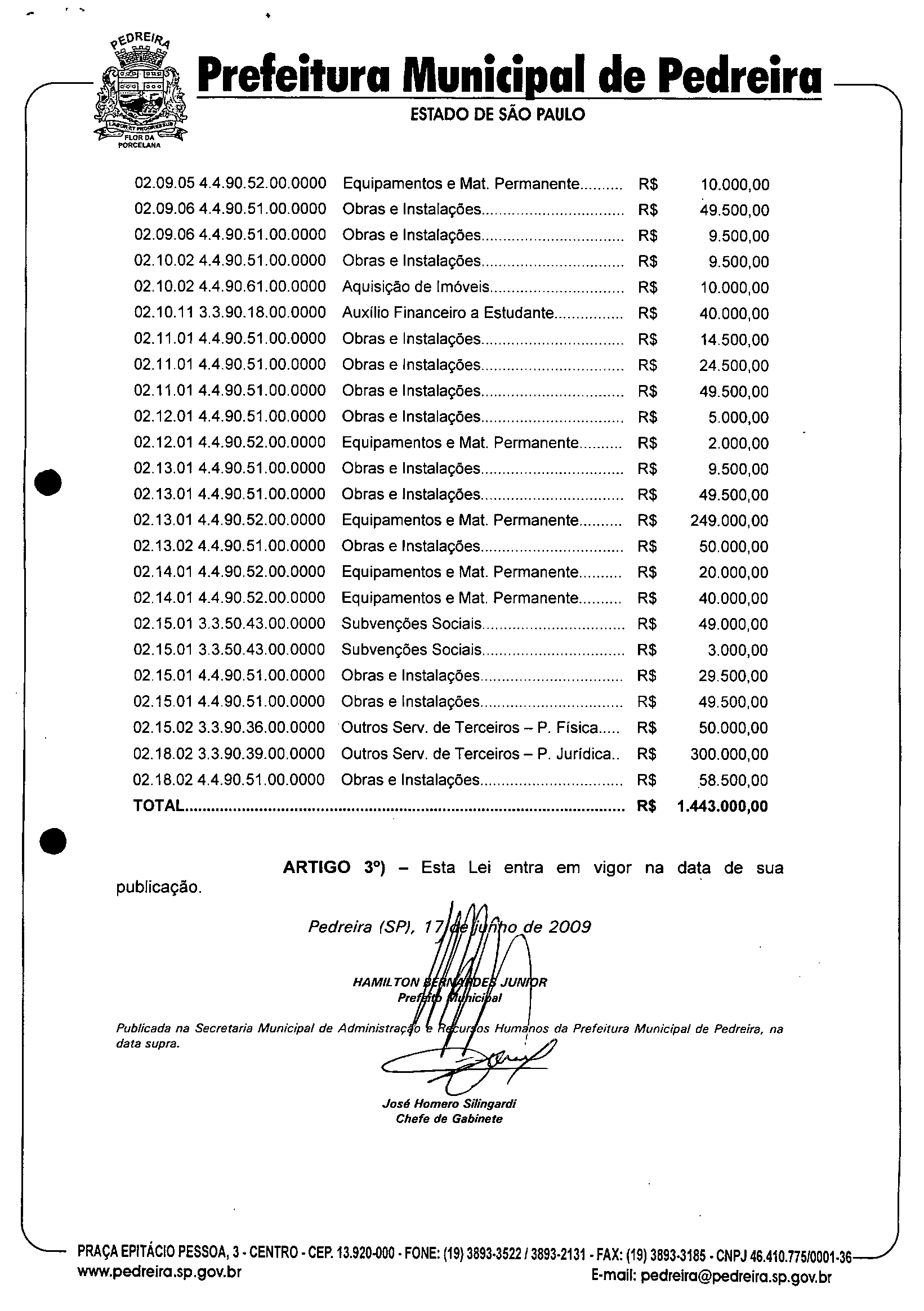 Ementa: Dispõe sobre a criação de crédito adicional suplementar no valor de R$ 1.443.000,00 (um milhão, quatrocentos e quarenta e três mil reais) e dá outras providências.