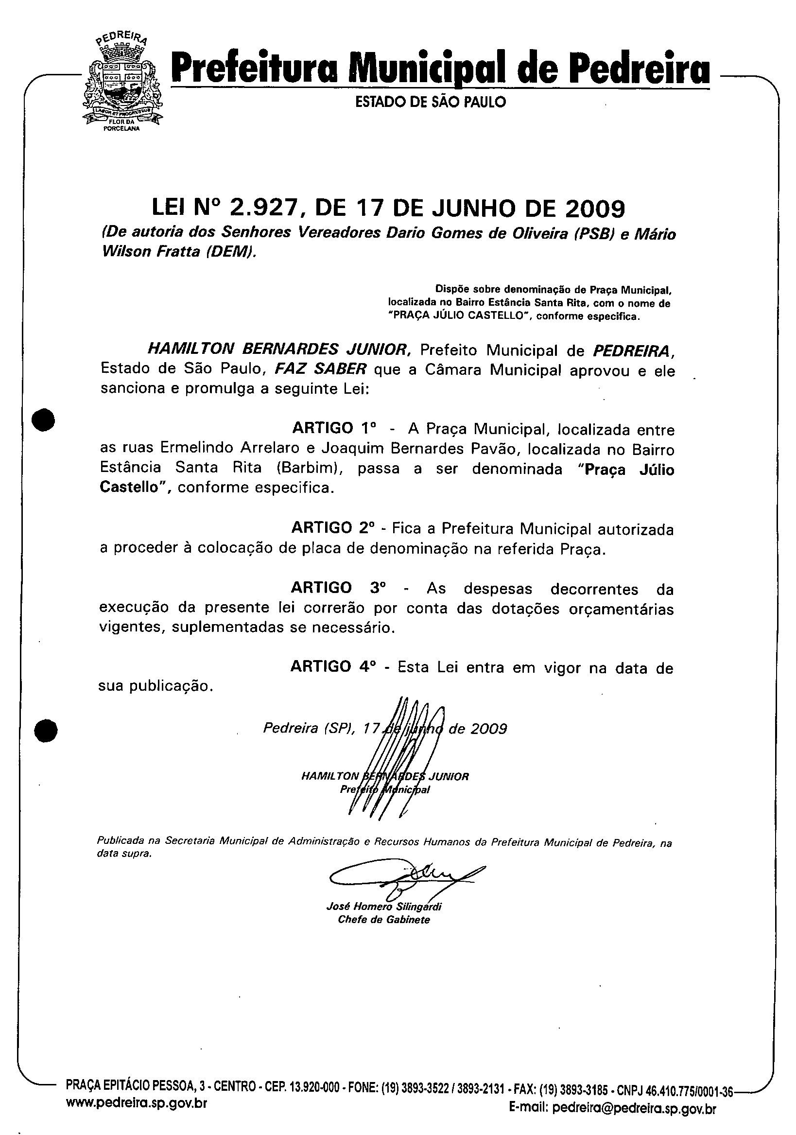 Ementa: Dispõe sobre denominação de Praça Municipal. localizada no Bairro Estância Santa Rita com o nome de "PRAÇA JÚLIO CASTELLO", conforme especifica.