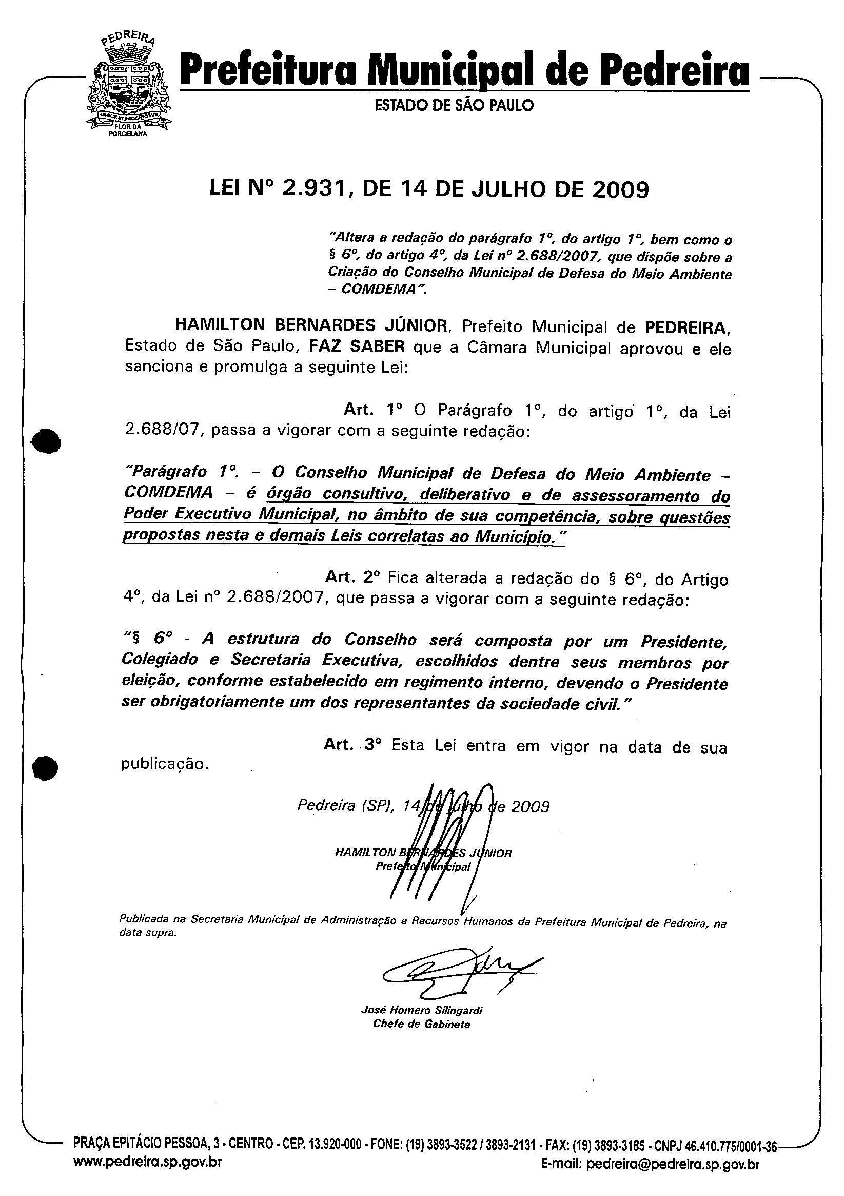 Ementa: "Altera a redação do parágrafo 1°, do artigo 1°, bem como o § 6°, do artigo 4°, da Lei nº 2.688/2007, que dispõe sobre a Criação do Conselho Municipal de Defesa do Meio Ambiente -COMDEMA ".