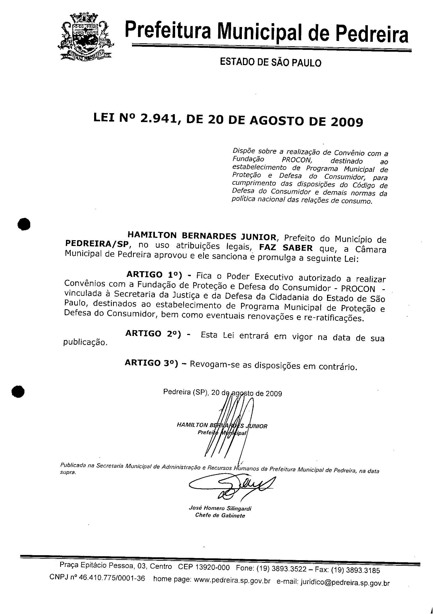 Ementa: Dispõe sobre a realização de Convênio com a Fundação PROCON, destinado ao estabelecimento de Programa Municipal de Proteção e Defesa do Consumidor, para cumprimento das disposições do Código de Defesa do Consumidor e demais normas da política nacional das relações de consumo.