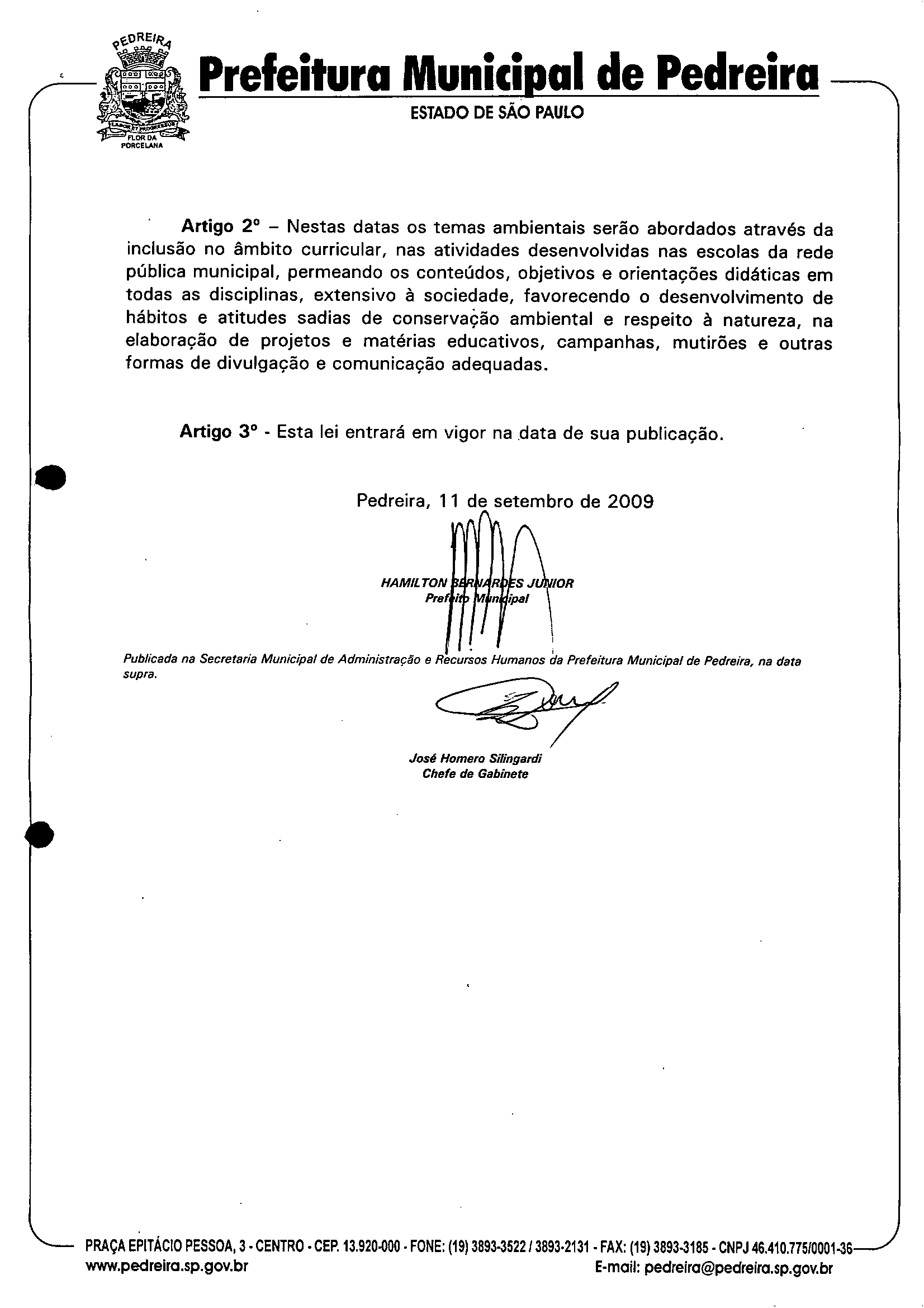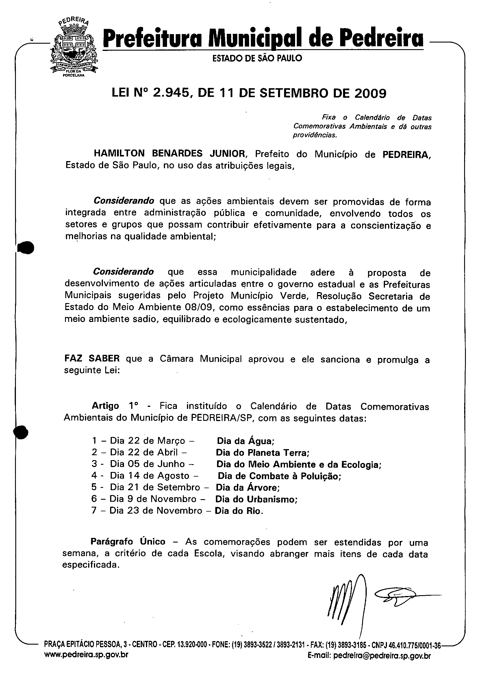 Lei Municipal - N° 2945 de 11/09/2009