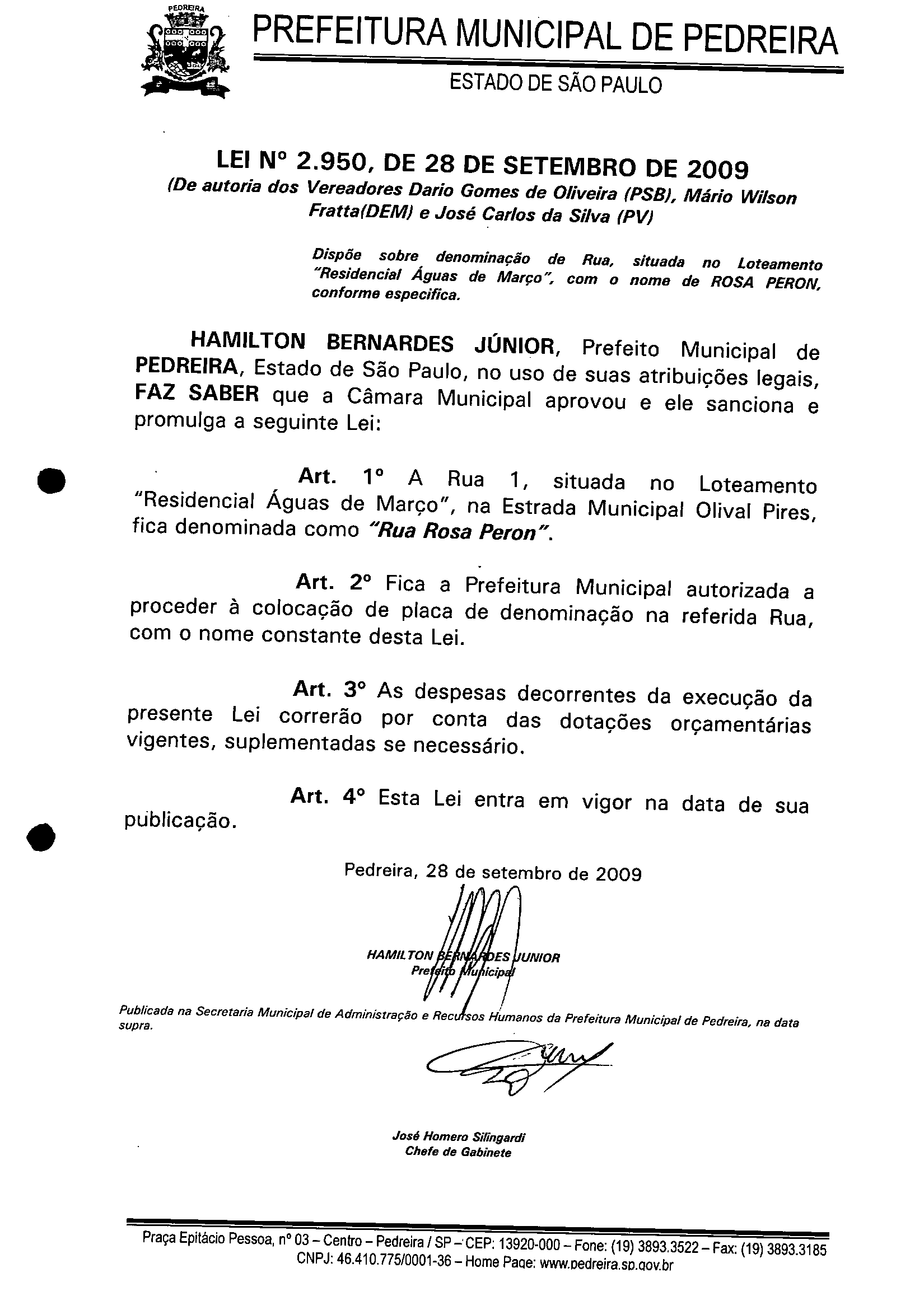 Lei Municipal - N° 2950 de 28/09/2009