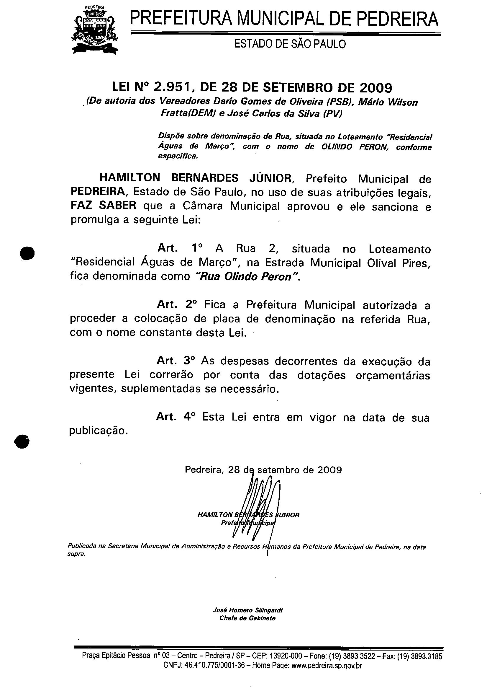 Lei Municipal - N° 2951 de 28/09/2009