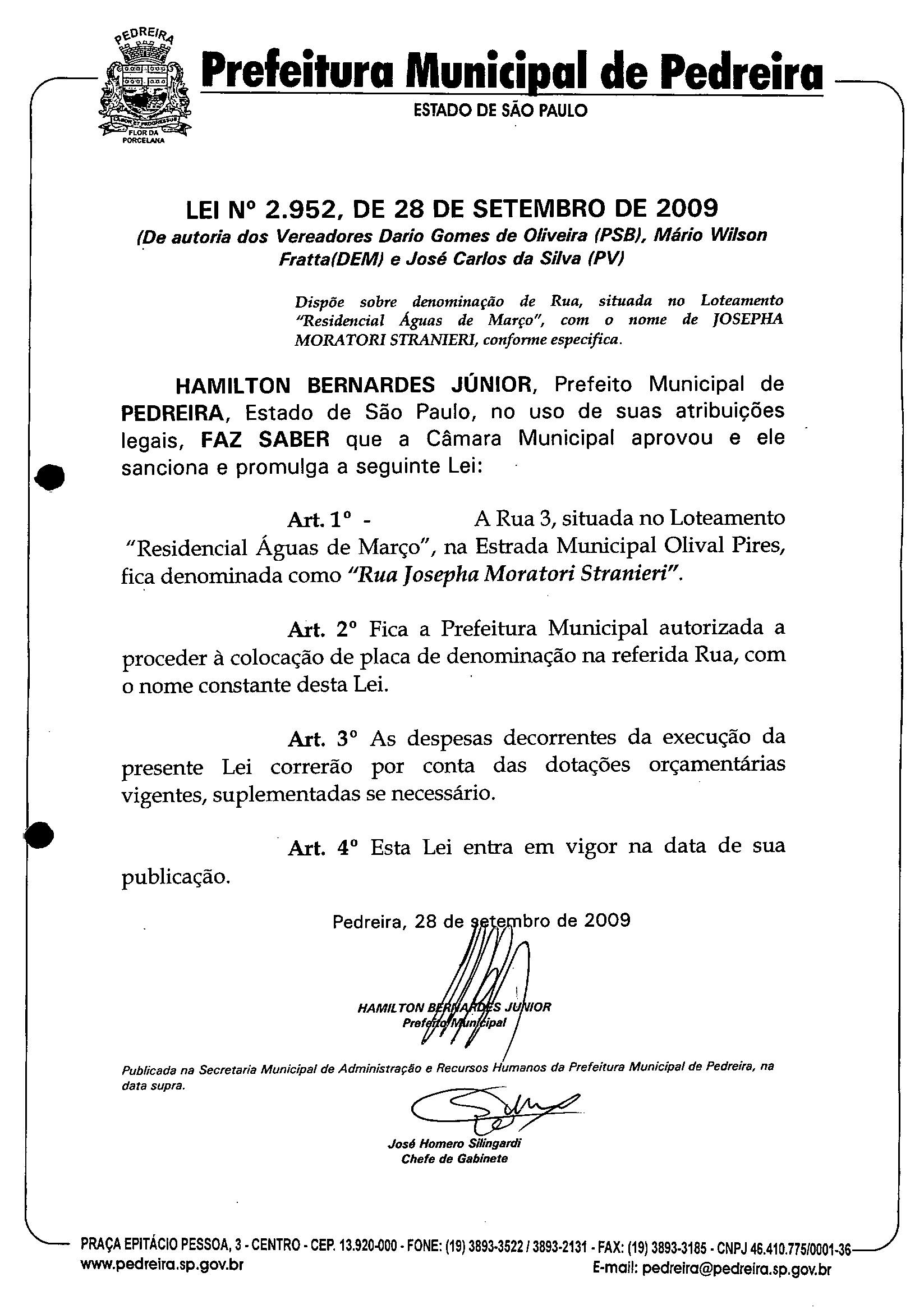 Ementa: Dispôe sobre denominação de Rua, situada no Loteamento "Residencial Aguas de Março", com o nome de JOSEPHA MORATORI STRANIERI, conforme especifica.