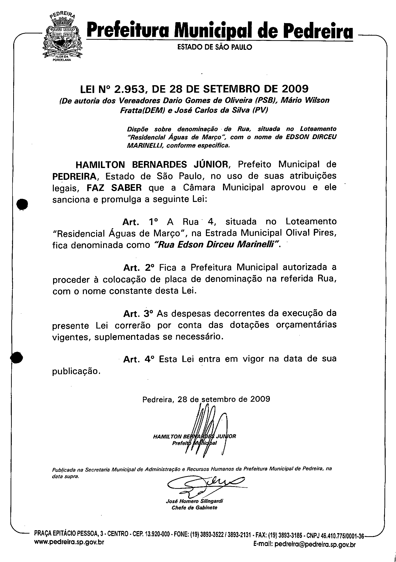Lei Municipal - N° 2953 de 28/09/2009