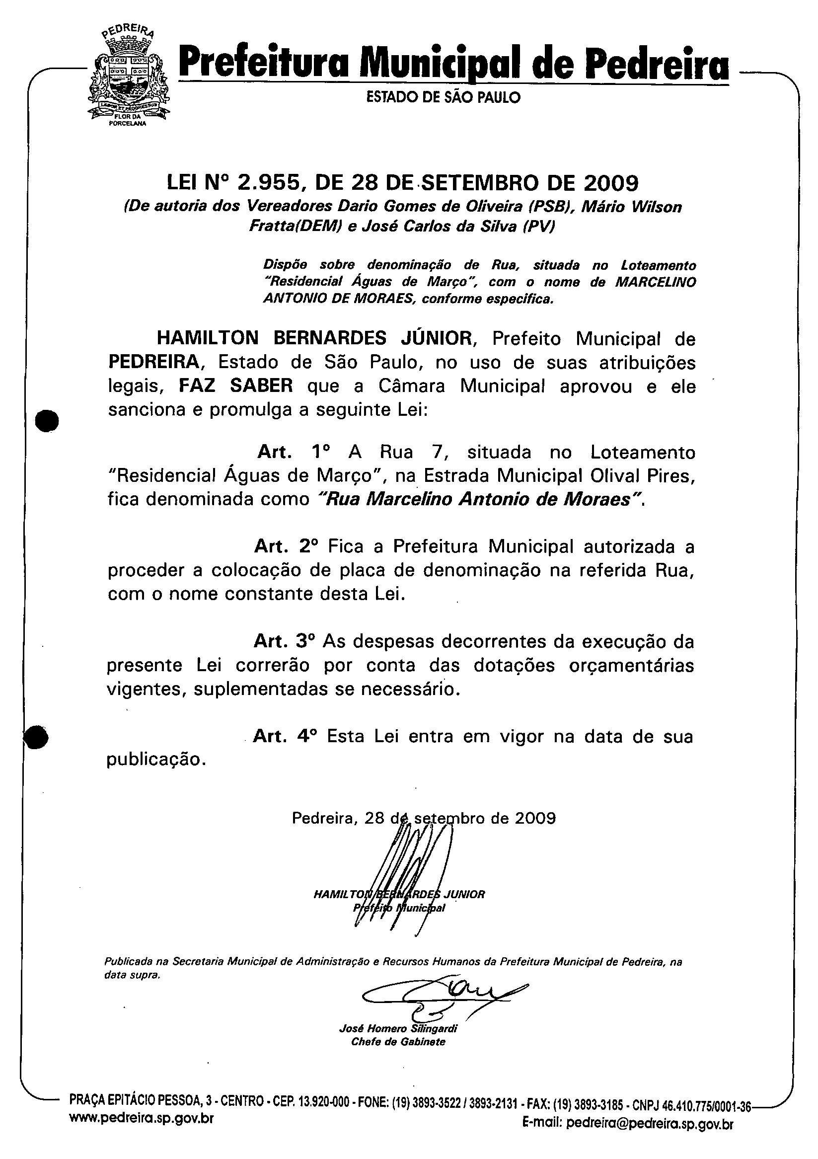 Lei Municipal - N° 2955 de 28/09/2009