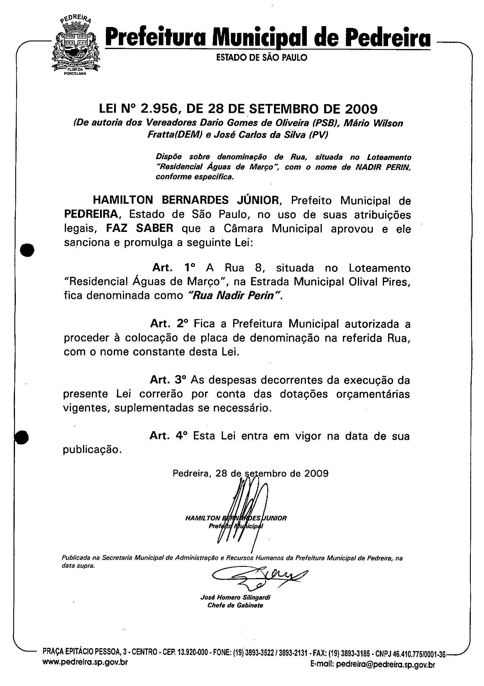 Lei Municipal - N° 2956 de 28/09/2009
