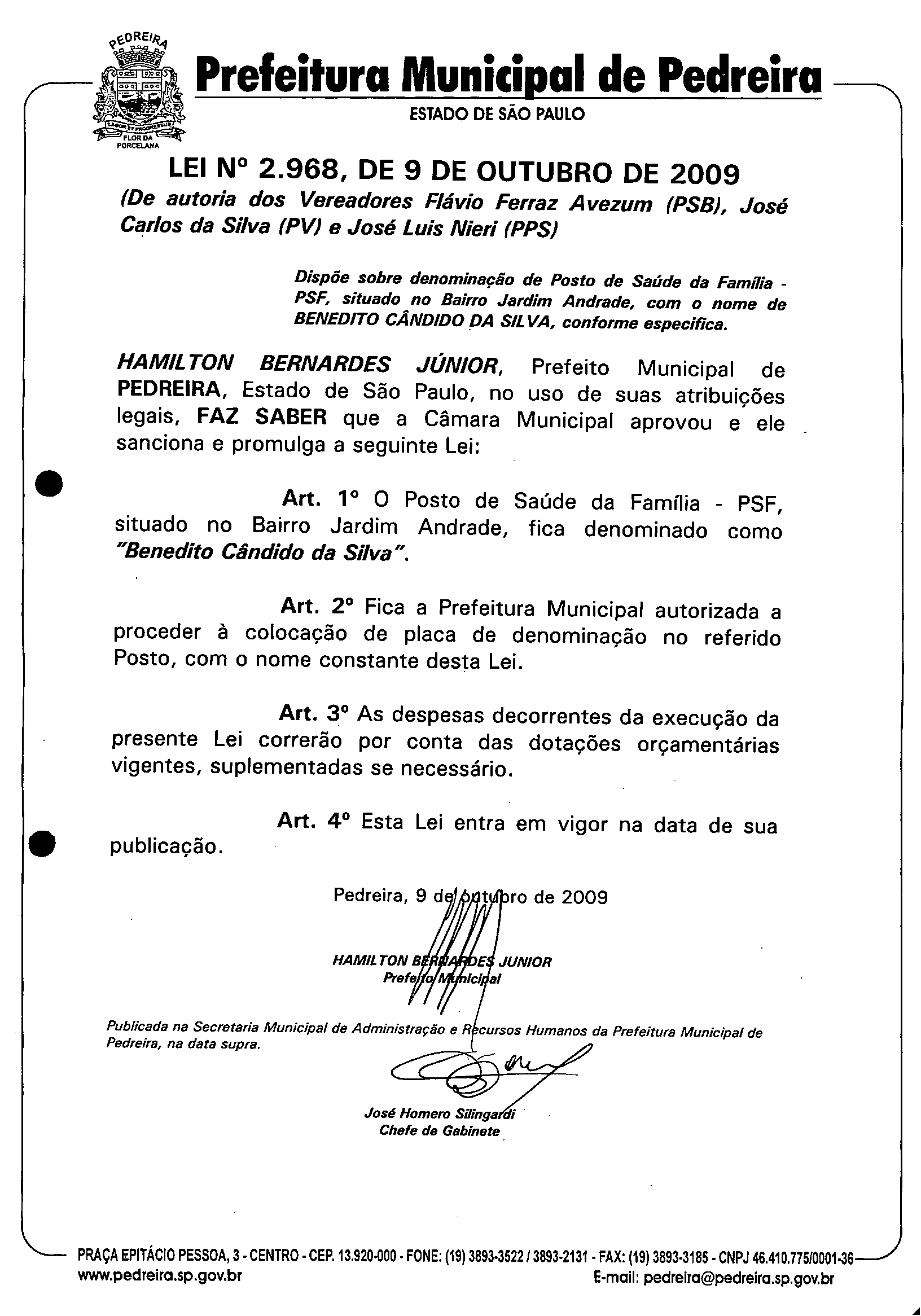 Lei Municipal - N° 2968 de 09/10/2009