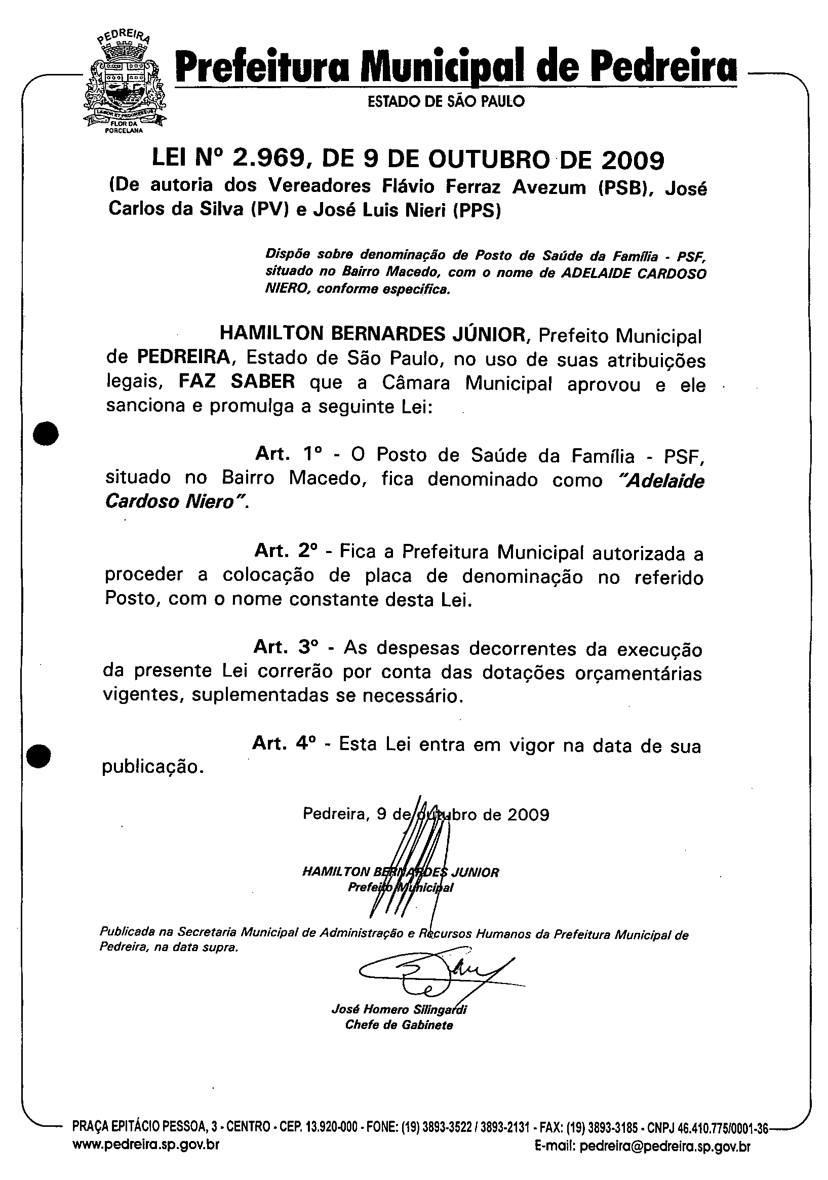 Ementa: Dispõe sobre denominação de Posto de Saúde da Familia -PSF, situado no Bairro Macedo, com o nome de ADELAIDE CARDOSO NIERO, conforme especifica.