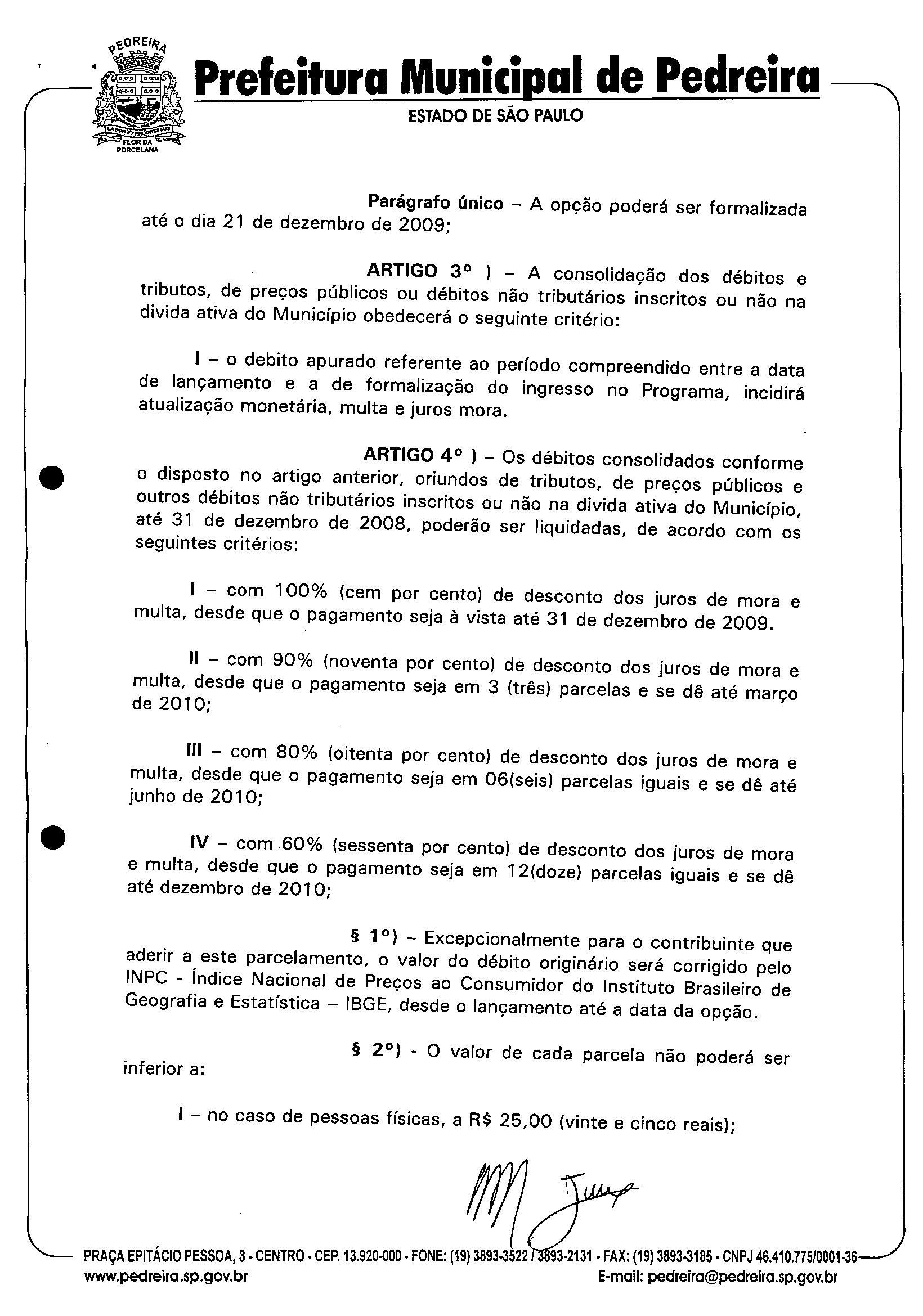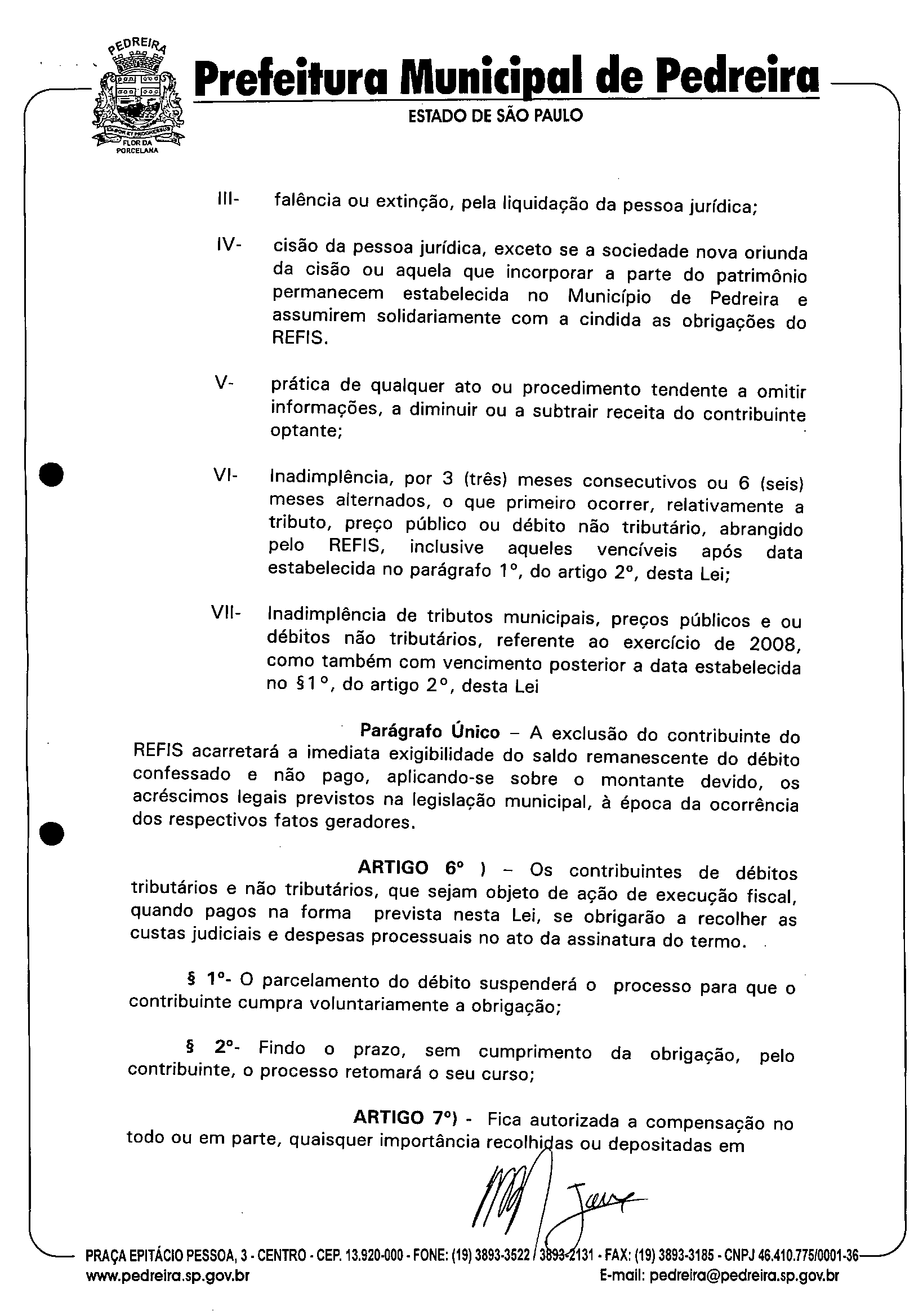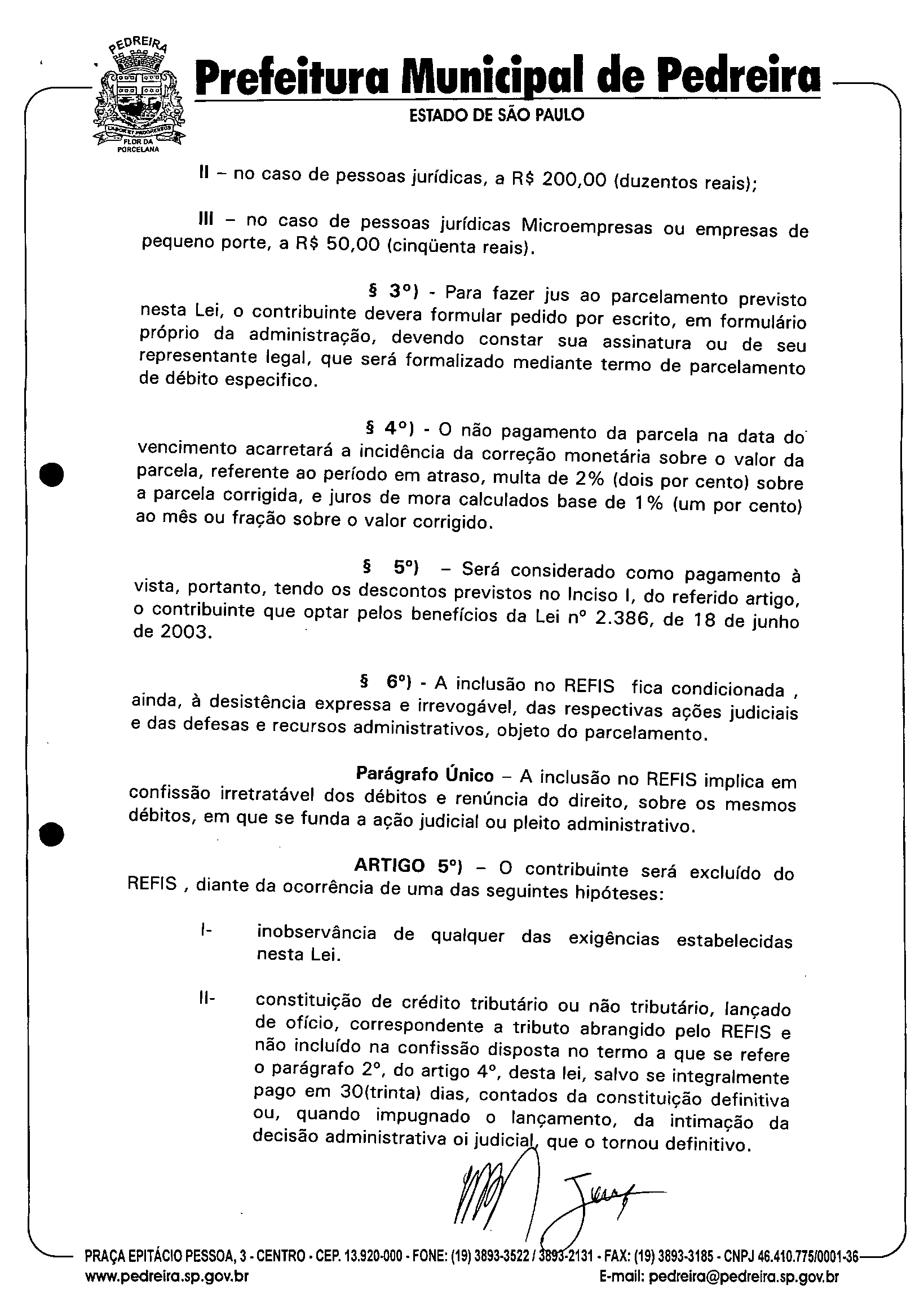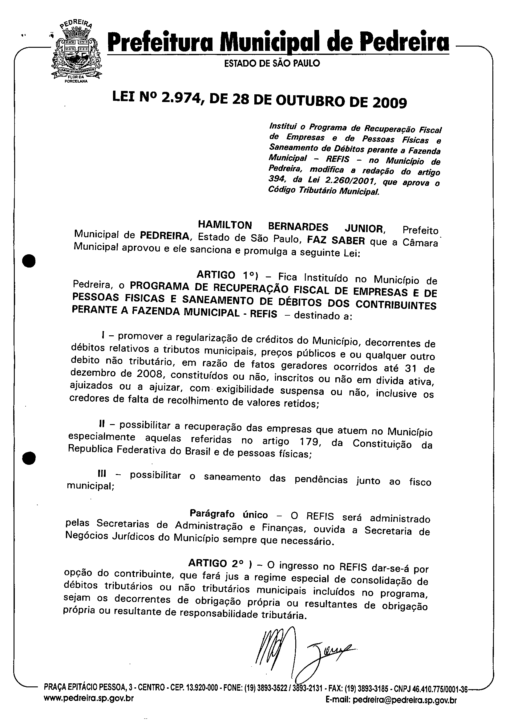 Ementa: Institui o Programa de Recuperação Fiscal de Empresas e de Pessoas Físicas e Saneamento de Débitos perante a Fazenda Municipal -REFIS -no Município de Pedreira, modifica a redação do artigo 394, da Leí 2.260/2001, que aprova o Código Tributário Municipal.