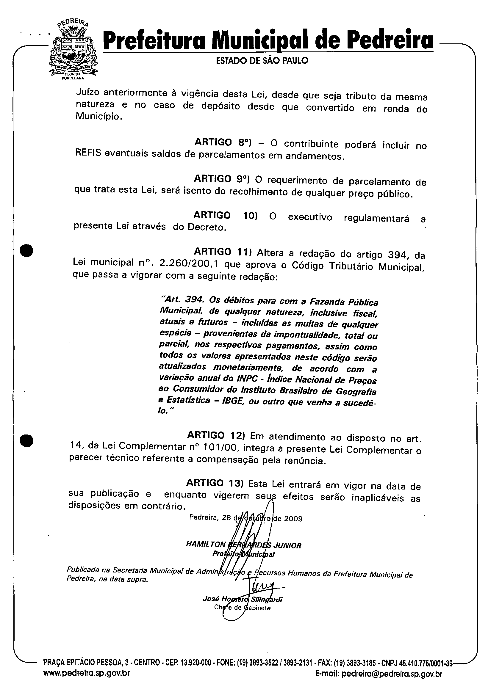 Lei Municipal - N° 2974 de 28/10/2009