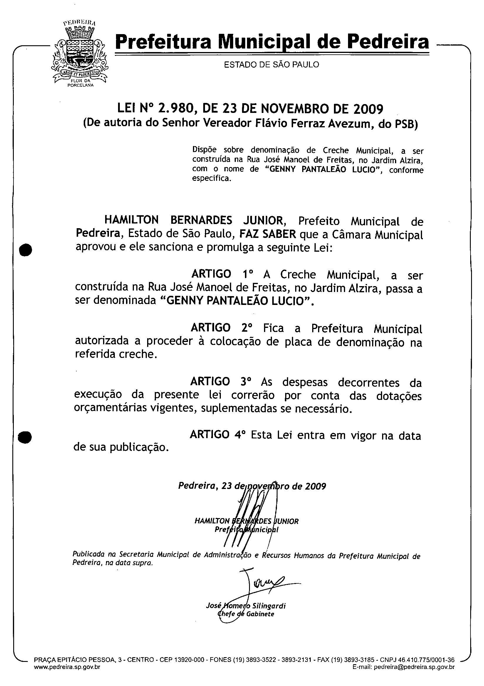 Lei Municipal - N° 2980 de 23/11/2009