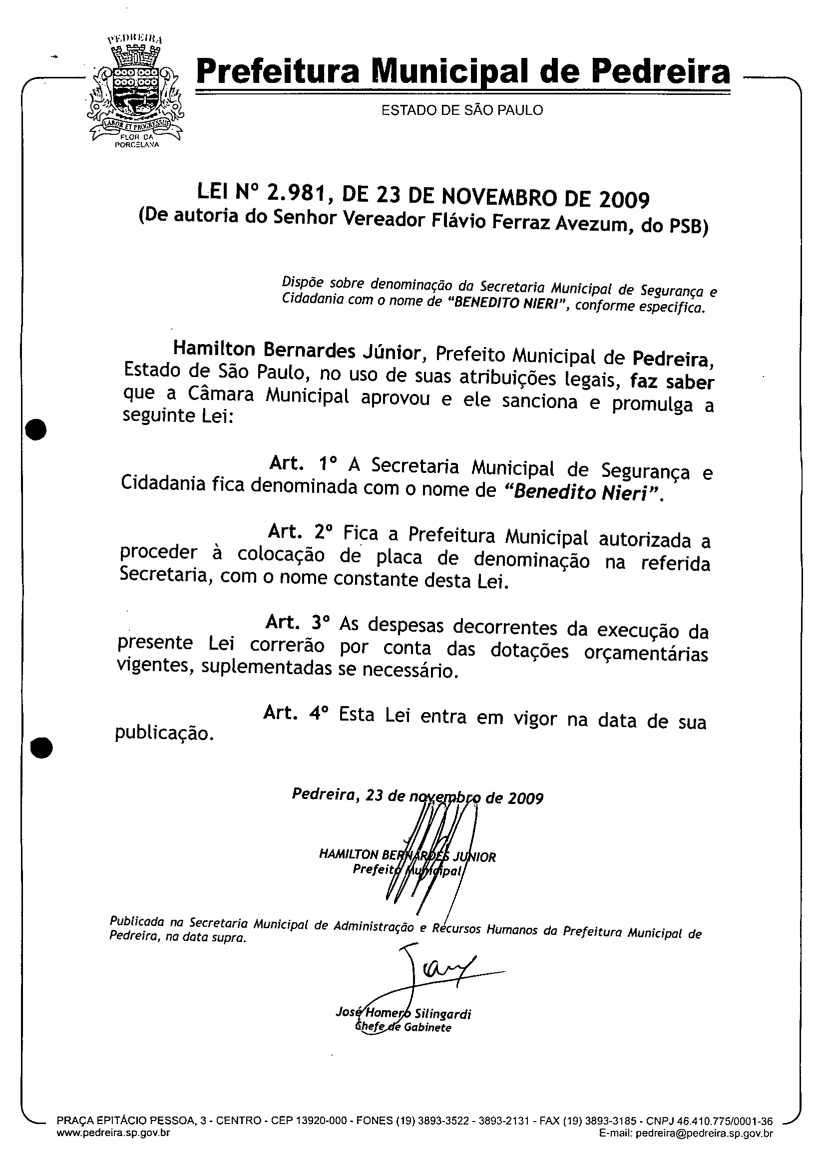 Lei Municipal - N° 2981 de 23/11/2009