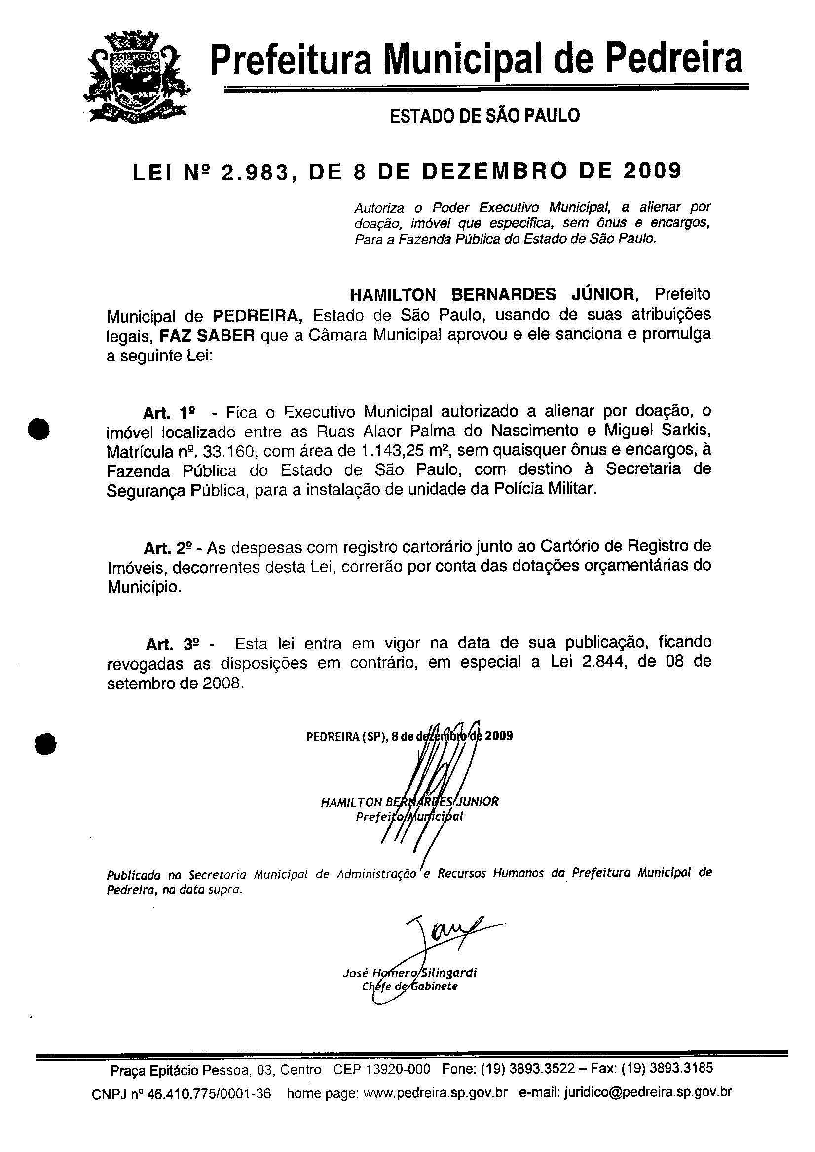 Ementa: Autoriza o Poder Executivo Municipal, a alienar por doação, imóvel que especifica, sem ônus e encargos, Para a Fazenda Pública do Estado de São Paulo.