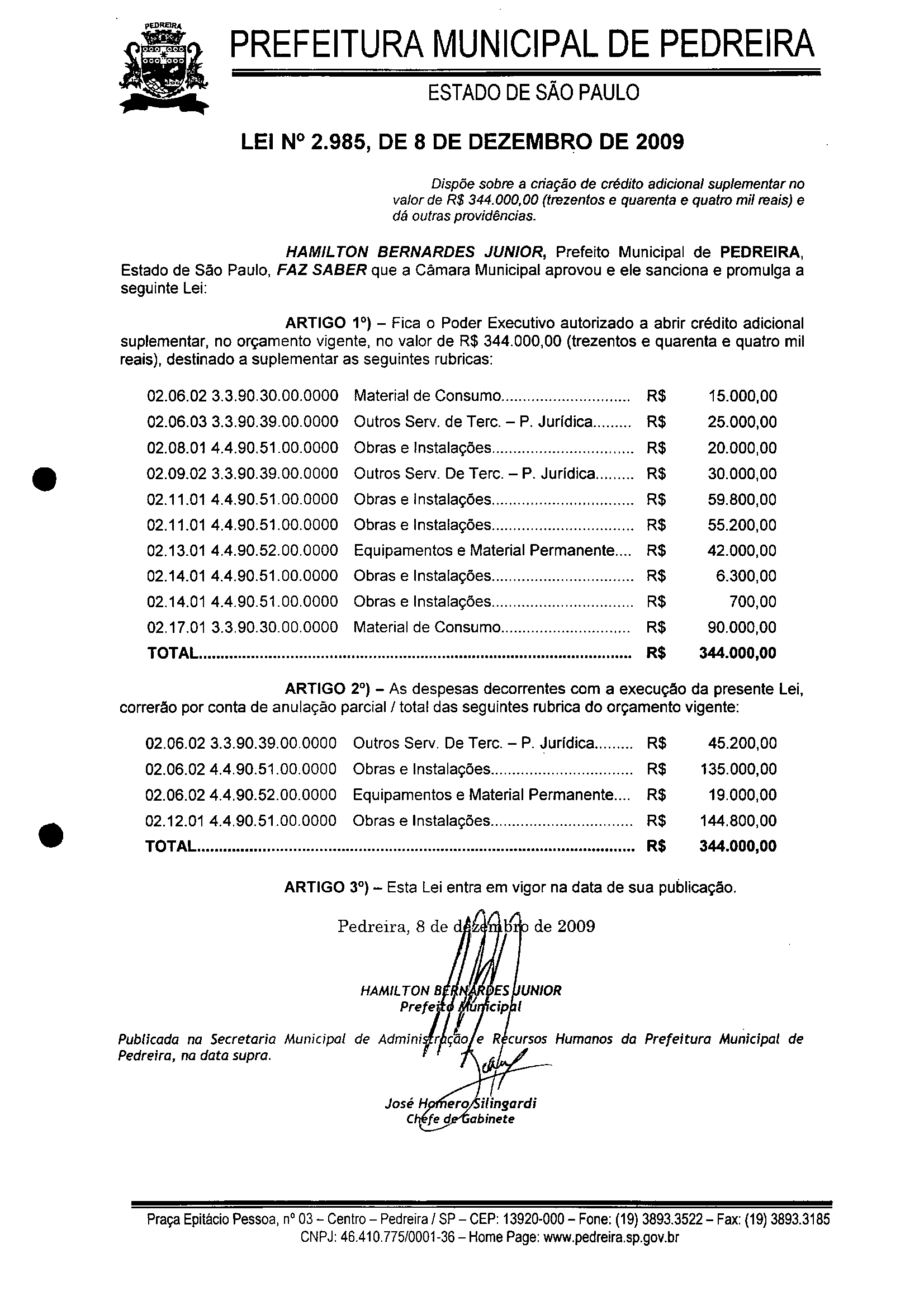 Lei Municipal - N° 2985 de 08/12/2009
