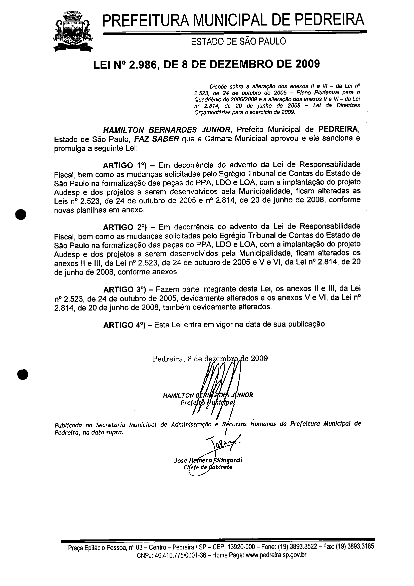 Lei Municipal - N° 2986 de 08/12/2009