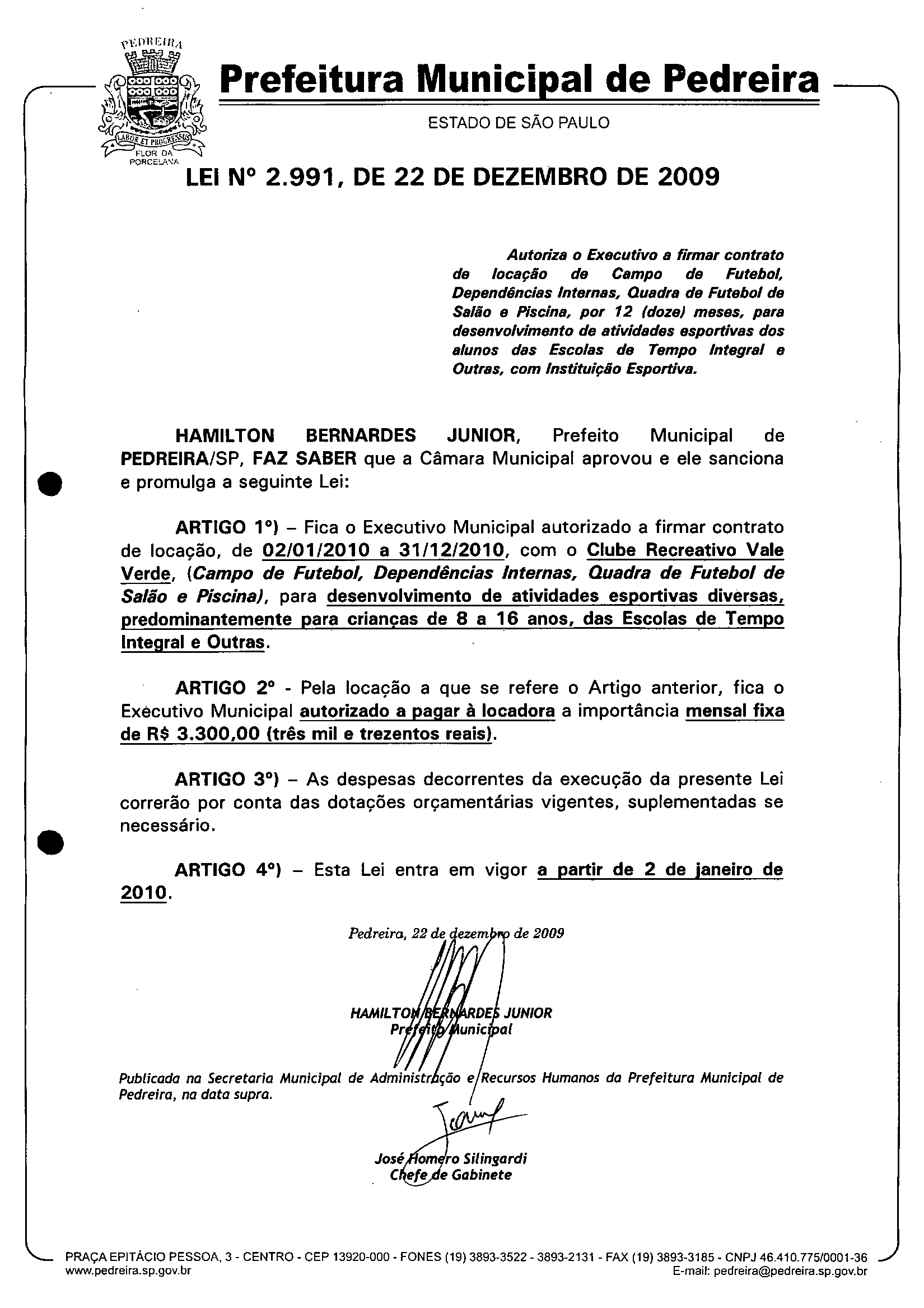 Ementa: Autoriza o Executivo a firmar contrato de locaçlio de Campo de Futebol, Dependências Internas, Quadra de Futebol de Salão e Piscina, por 12 (doze) meses, para desenvolvimento de atividades esportivas dos alunos das Escolas de Tempo Integral e Outras, com Instituição Esportiva.