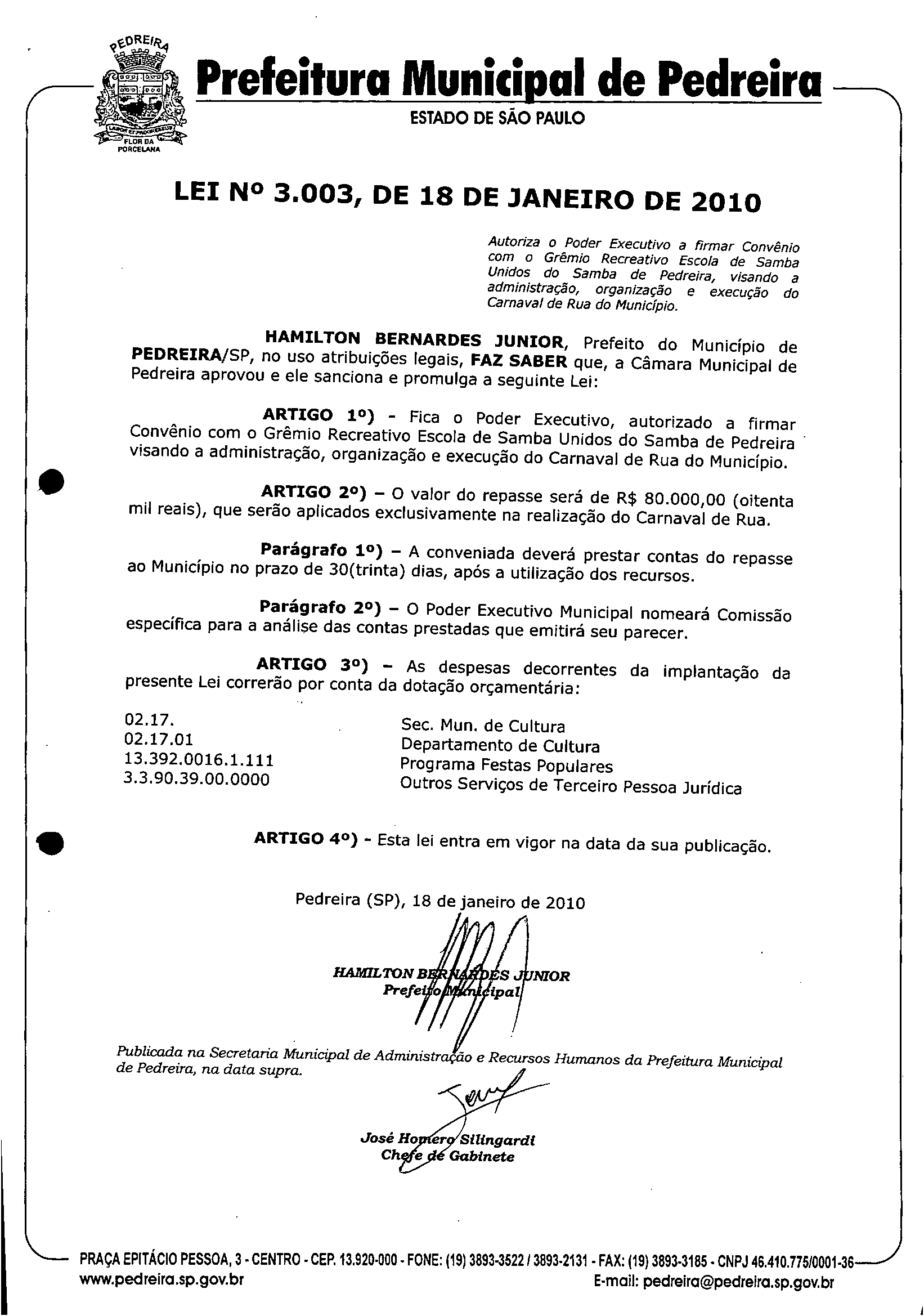 Lei Municipal - N° 3003 de 18/01/2010