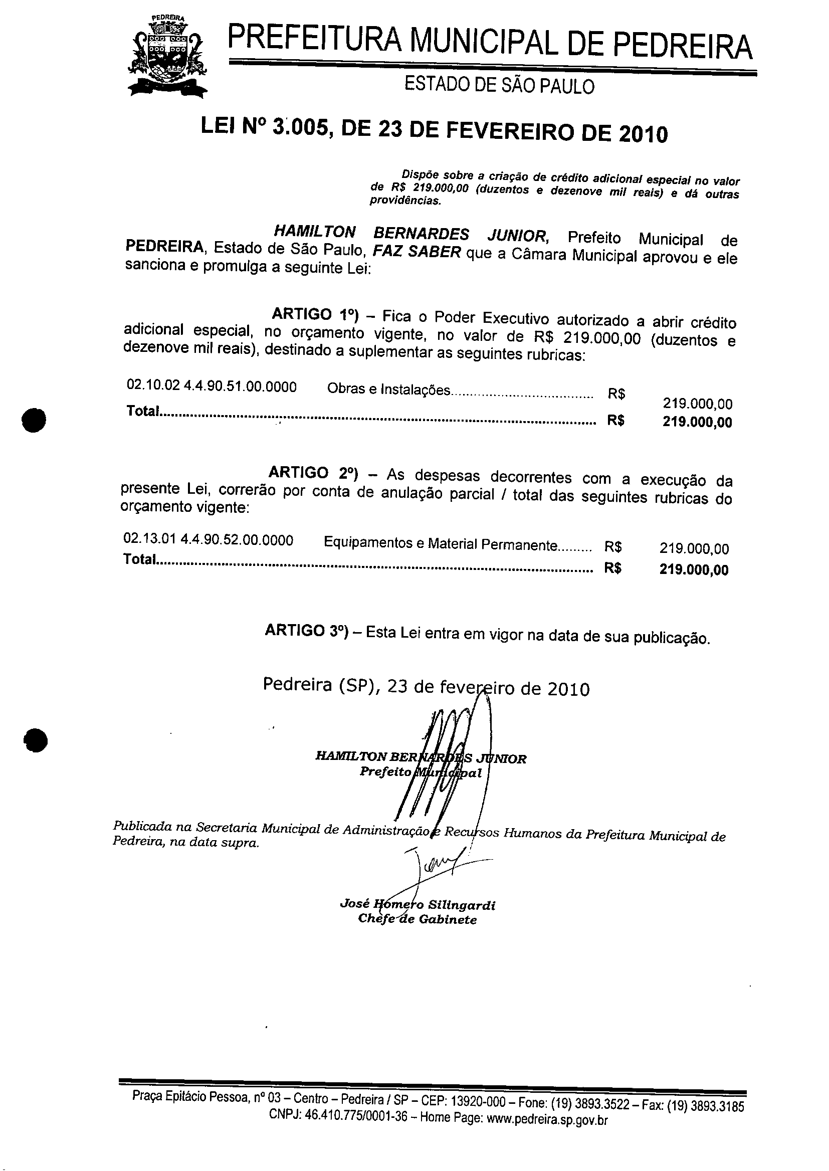 Ementa: Dispõe sobre a criação de crédito adicional especial no valor de R$ 219.000,00 (duzentos e dezenove mil reais) e dá outras providências.