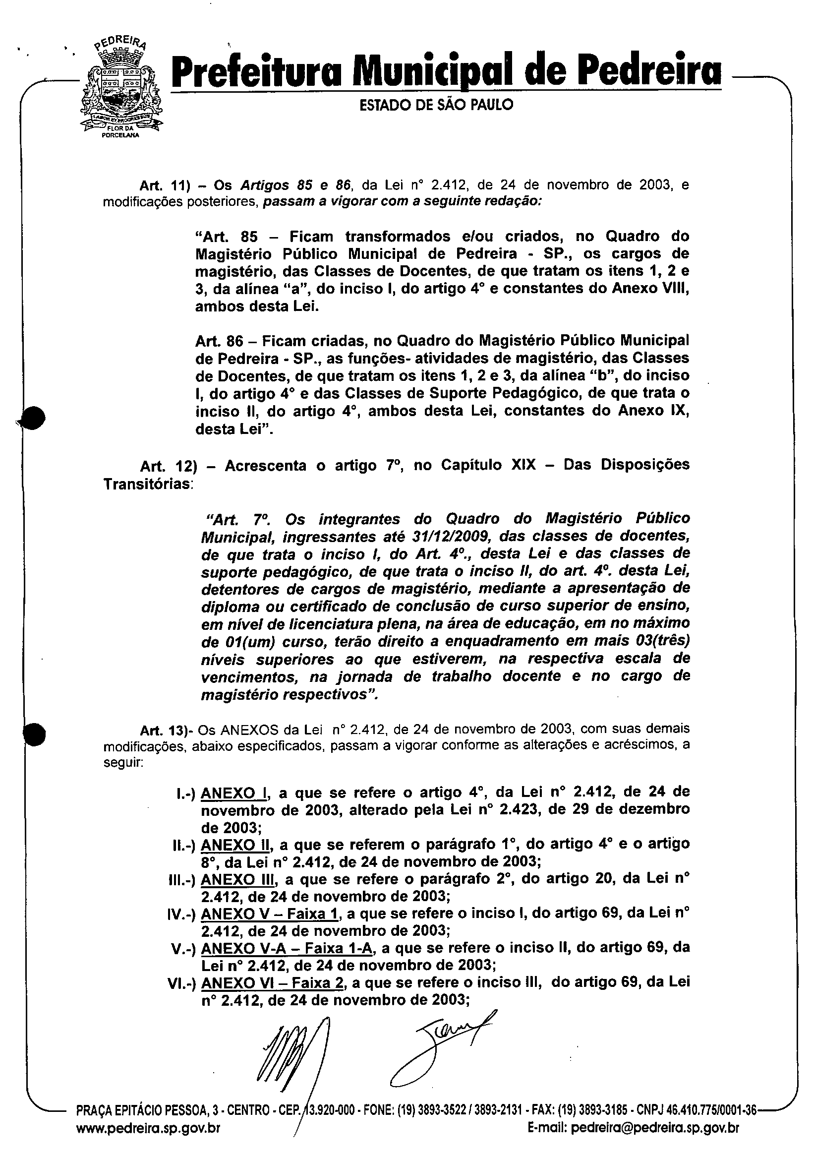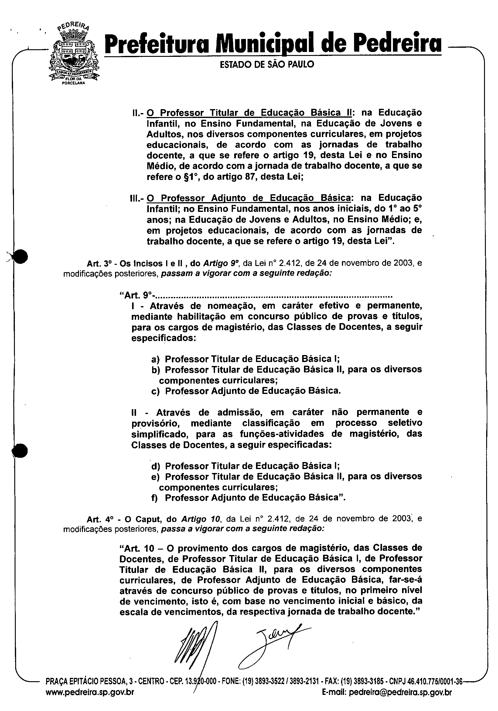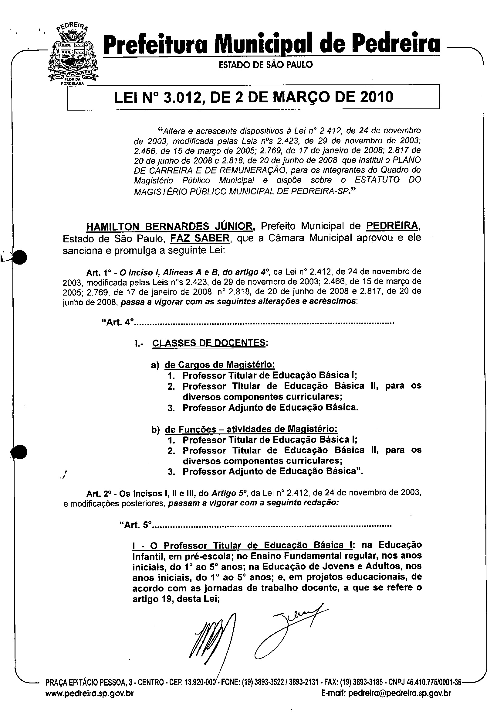 Ementa: "Altera e acrescenta dispositivos à Lei nº 2.412, de 24 de novembro de 2003, modificada pelas Leis nºs 2.423, de 29 de novembro de 2003; 2.466, de 15 de março de 2005; 2.769, de 17 de janeiro de 2008; 2.817 de 20 de junho de 2008 e 2.818, de 20 de junho de 2008, que institui o PLANO DE CARREIRA E DE REMUNERAÇÃO, para os integrantes do Quadro do Magistério Público Municipal e dispõe sobre o ESTA TUTO DO MAGISTf.RIO PÚBLICO MUNICIPAL DE PEDREIRA-SP."