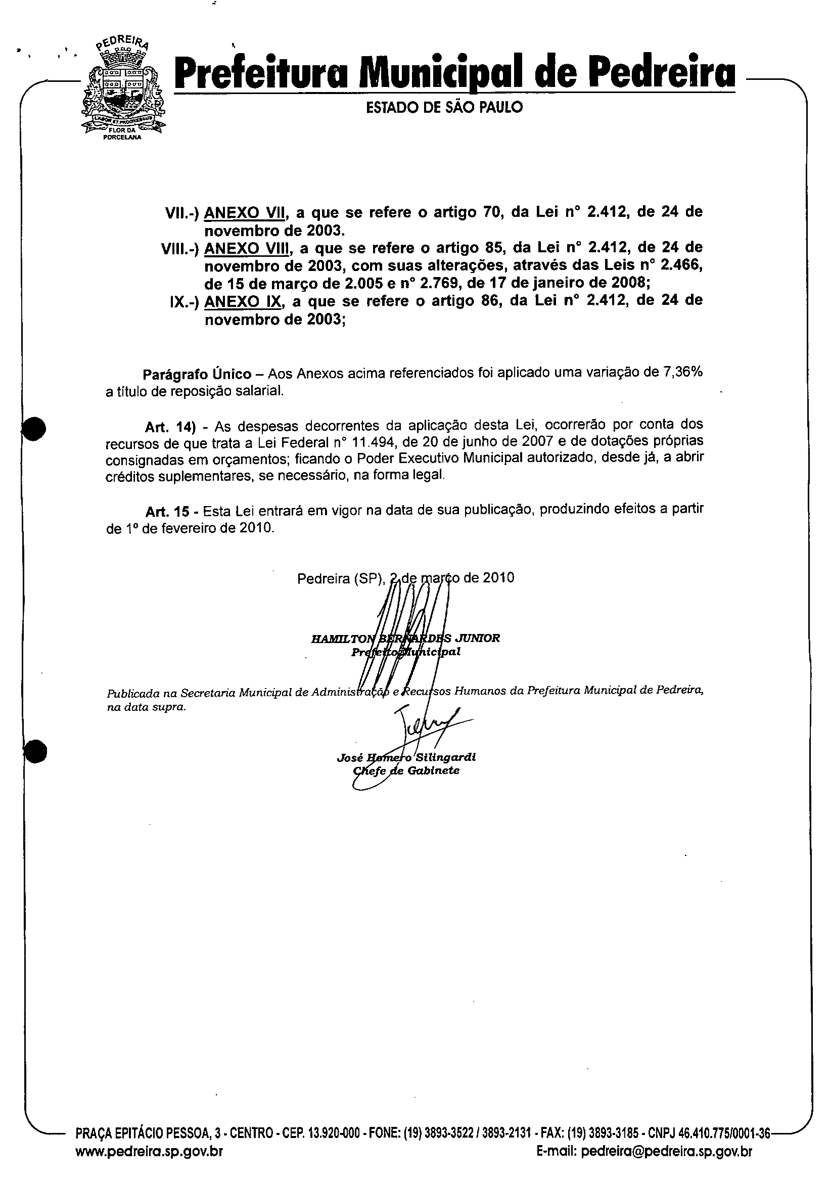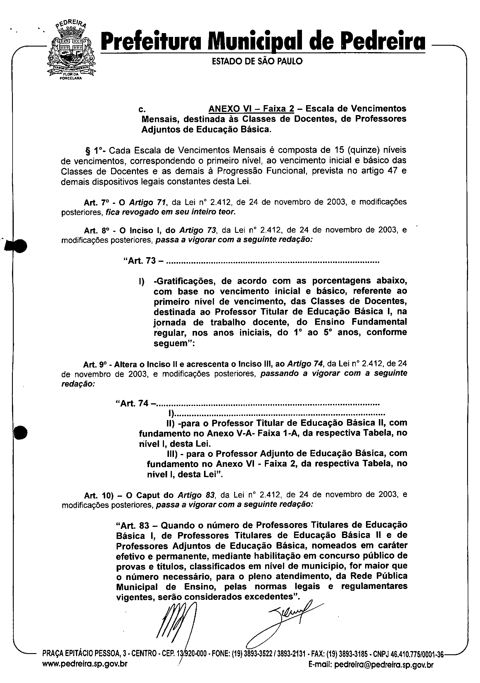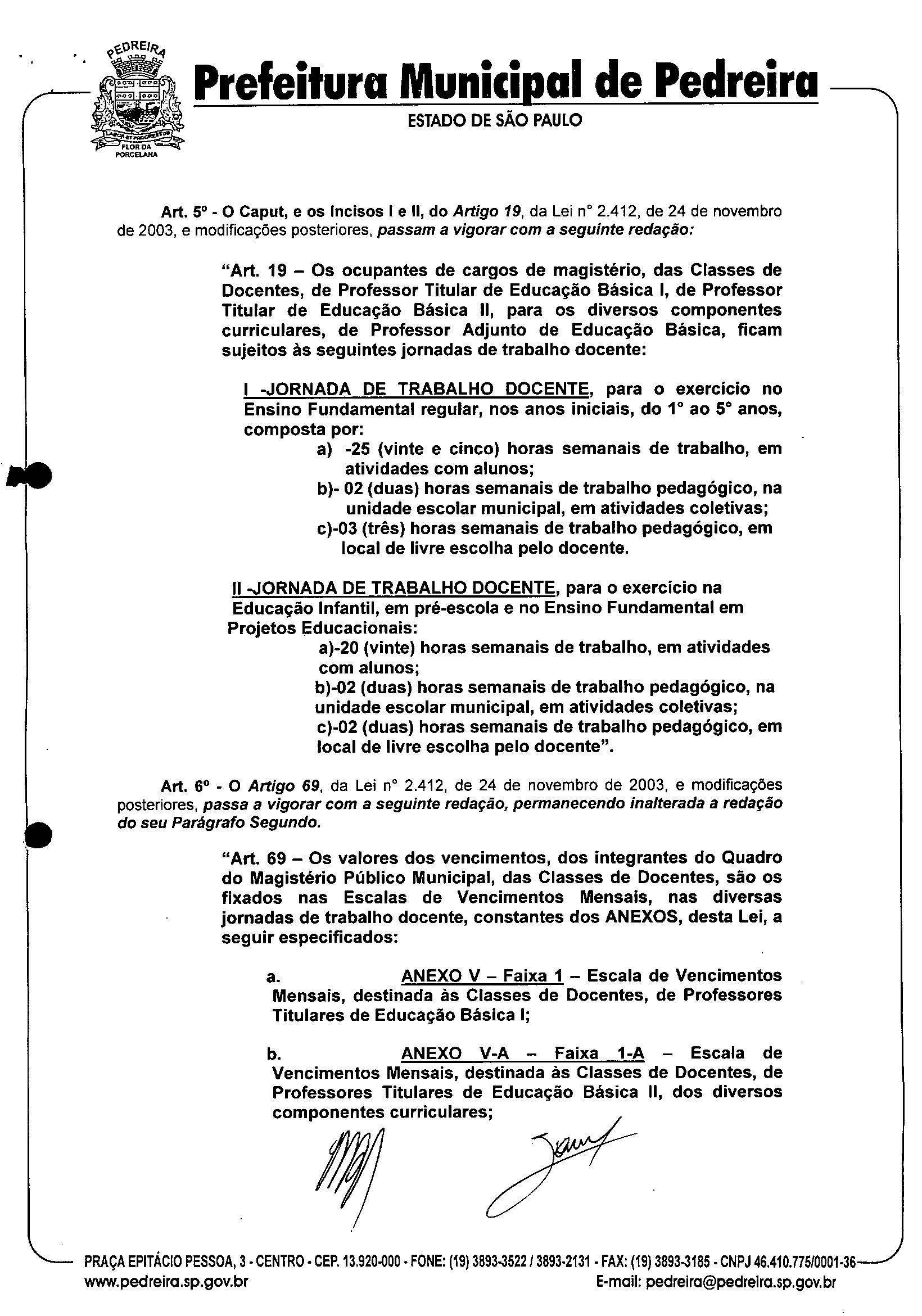 Ementa: "Altera e acrescenta dispositivos à Lei nº 2.412, de 24 de novembro de 2003, modificada pelas Leis nºs 2.423, de 29 de novembro de 2003; 2.466, de 15 de março de 2005; 2.769, de 17 de janeiro de 2008; 2.817 de 20 de junho de 2008 e 2.818, de 20 de junho de 2008, que institui o PLANO DE CARREIRA E DE REMUNERAÇÃO, para os integrantes do Quadro do Magistério Público Municipal e dispõe sobre o ESTA TUTO DO MAGISTf.RIO PÚBLICO MUNICIPAL DE PEDREIRA-SP."
