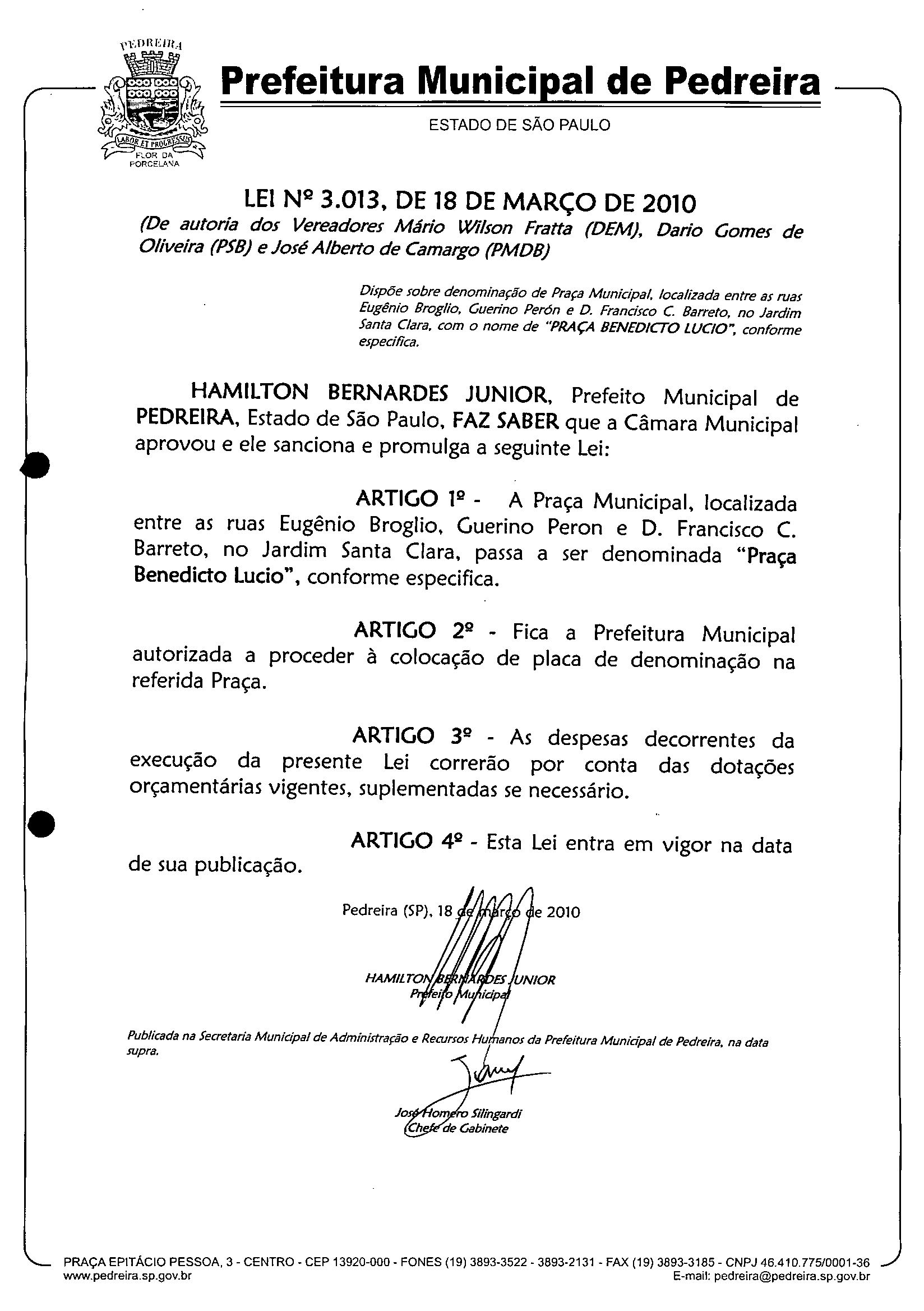 Lei Municipal - N° 3013 de 18/03/2010