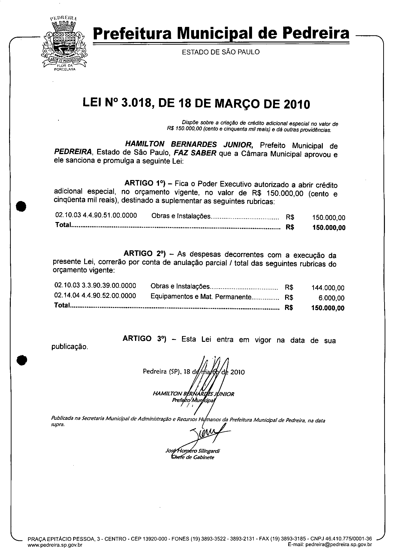 Ementa: Dispõe sobre a criação de crédito adicional especial no valor de R$ 150.000,00 (cento e cinquenta mil reais) e dá outras providências.