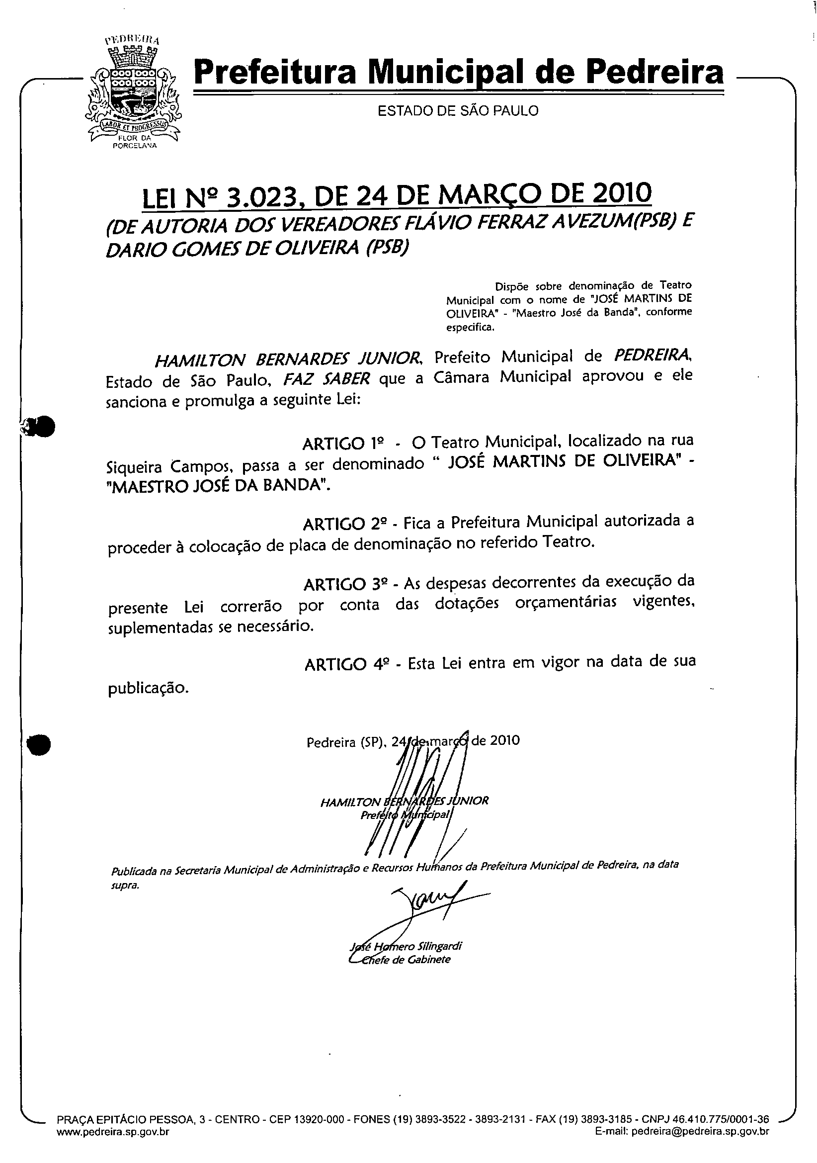 Ementa: Dispõe sobre denominação de Teatro Municipal com o nome de "JOSÉ MARTINS DE OLIVEIRA" "Maestro José da Banda", conforme especifica.