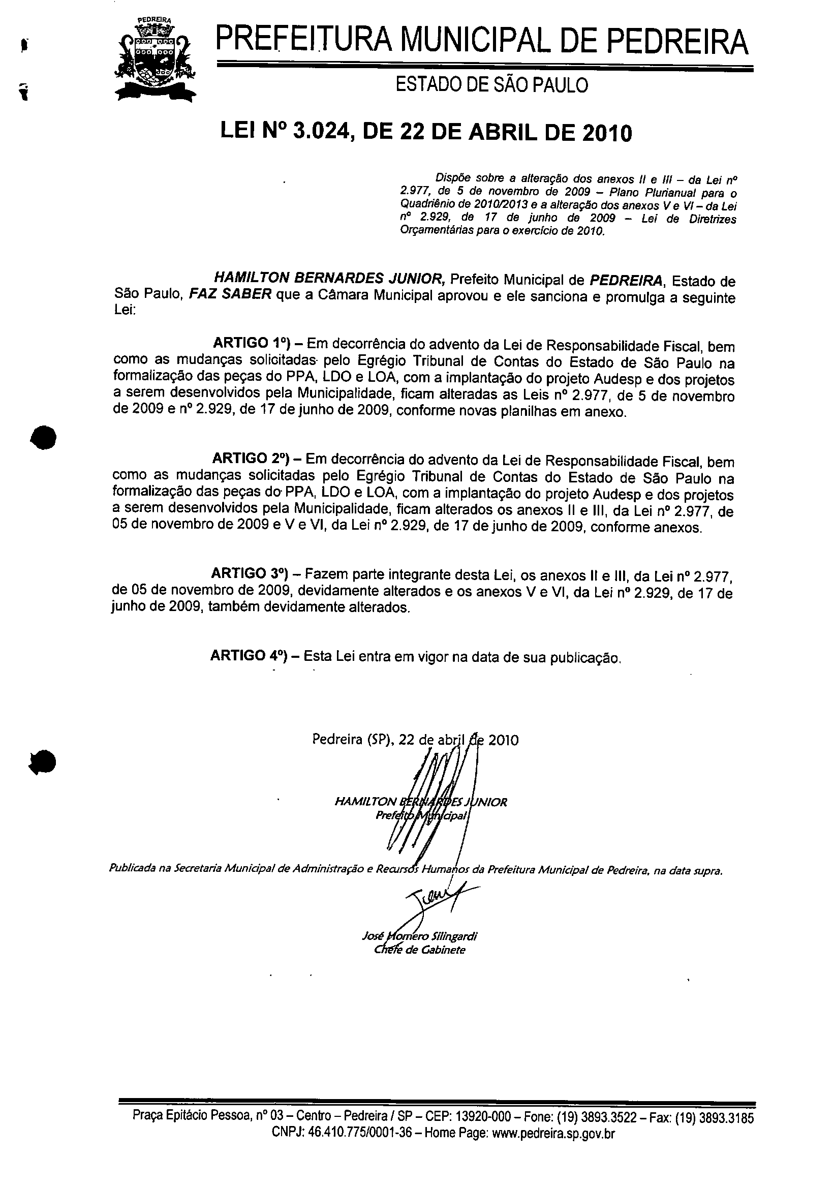 Lei Municipal - N° 3024 de 22/04/2010