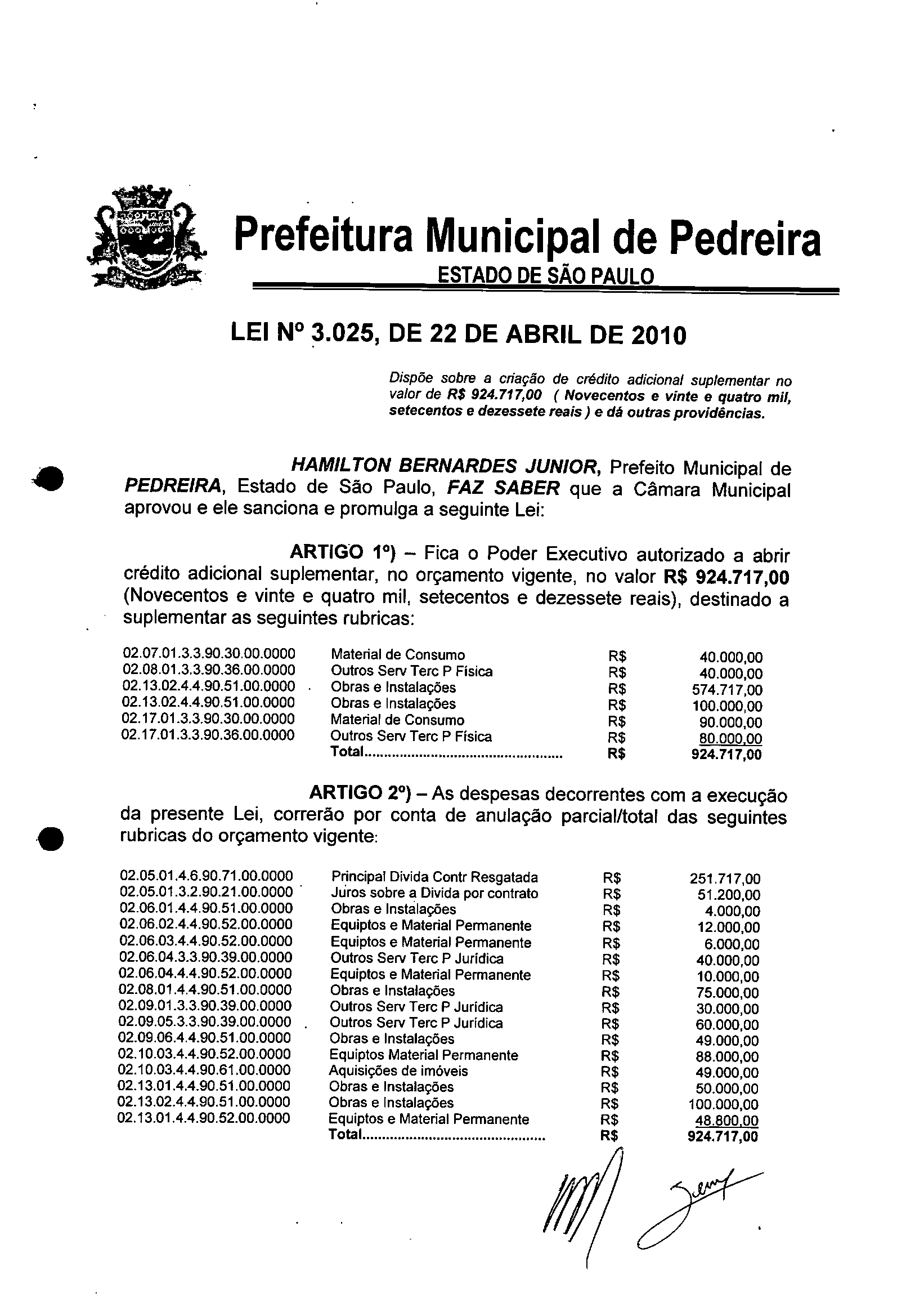 Ementa: Dispõe sobre a criação de crédito adicional suplementar no valor de R$ 924.717,00 (Novecentos e vinte e quatro mil, setecentos e dezessete reais) e dá outras providências.