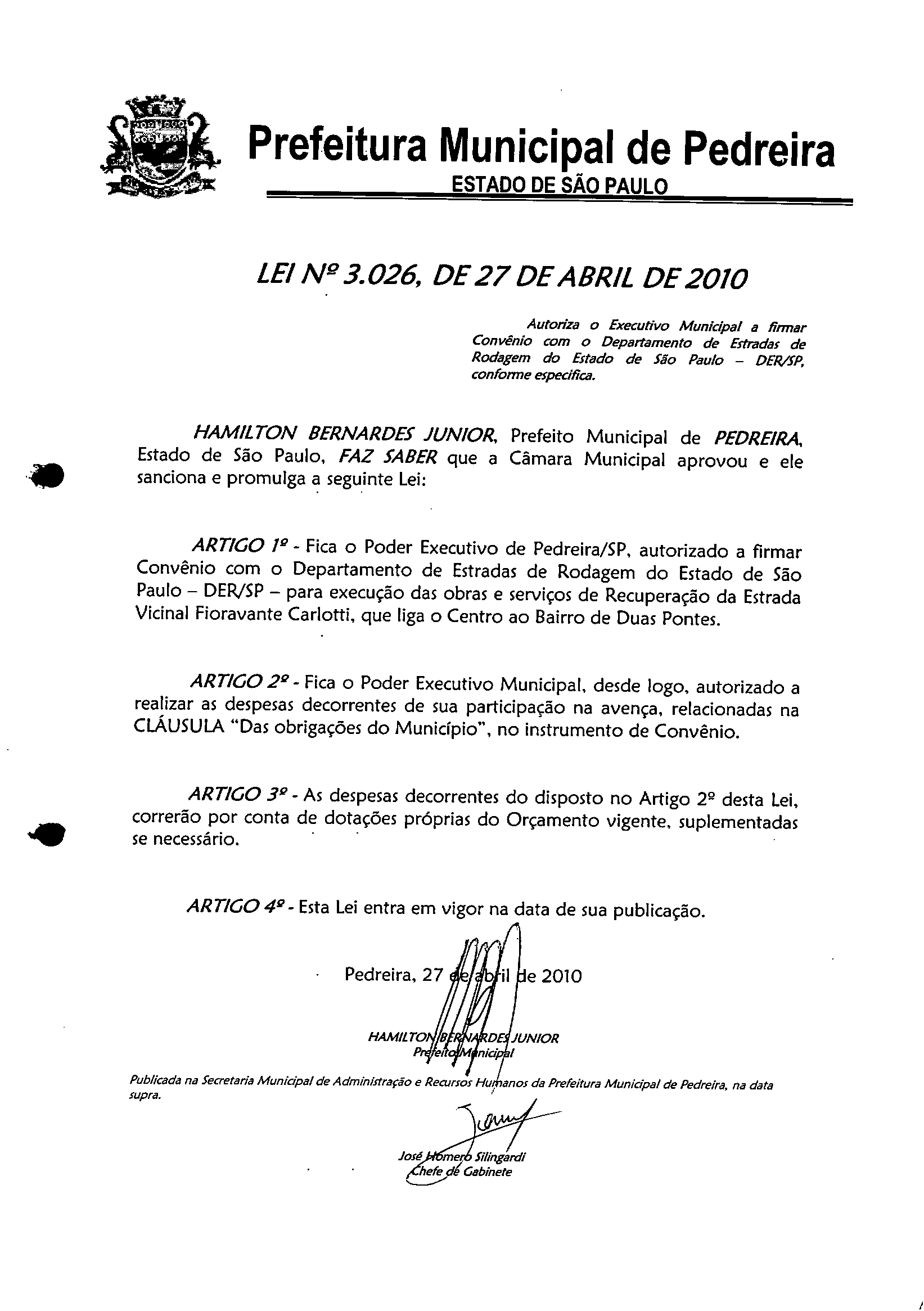 Ementa: Autoriza o Executivo Municipal a firmar Convênio com o Departamento de Estradas de Rodagem do Estado de São Paulo -DER/SP, conforme especifica.