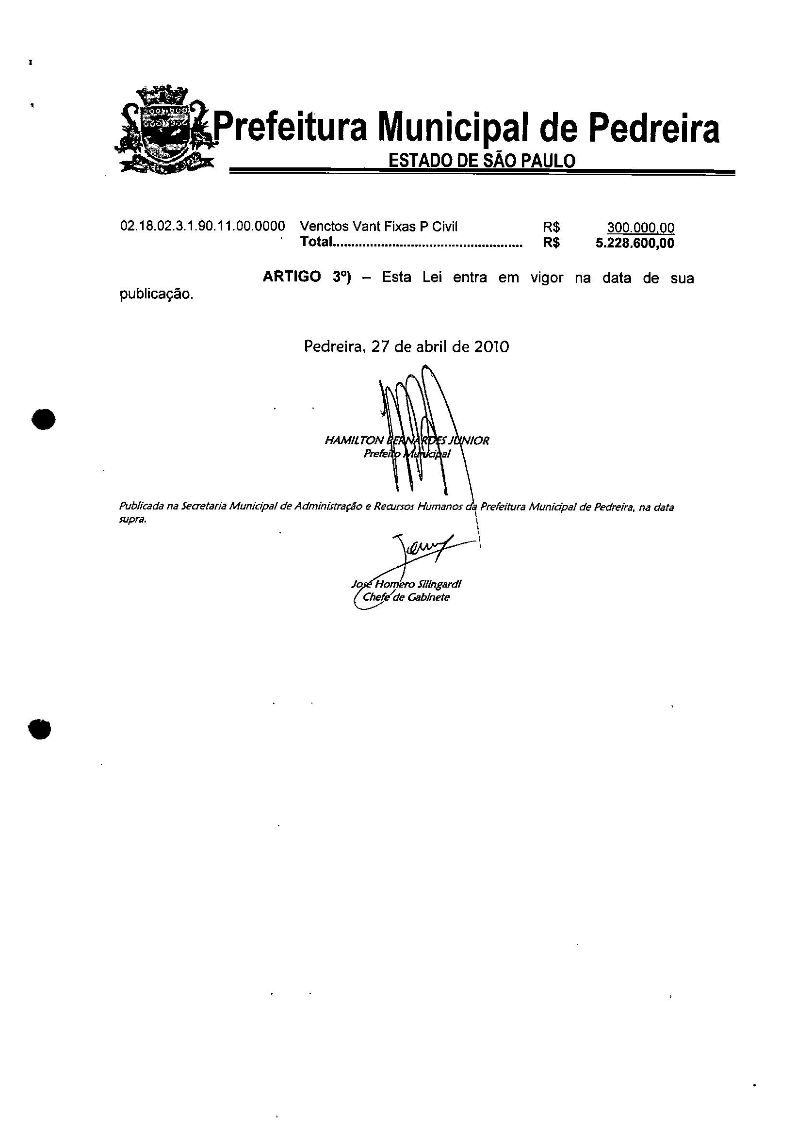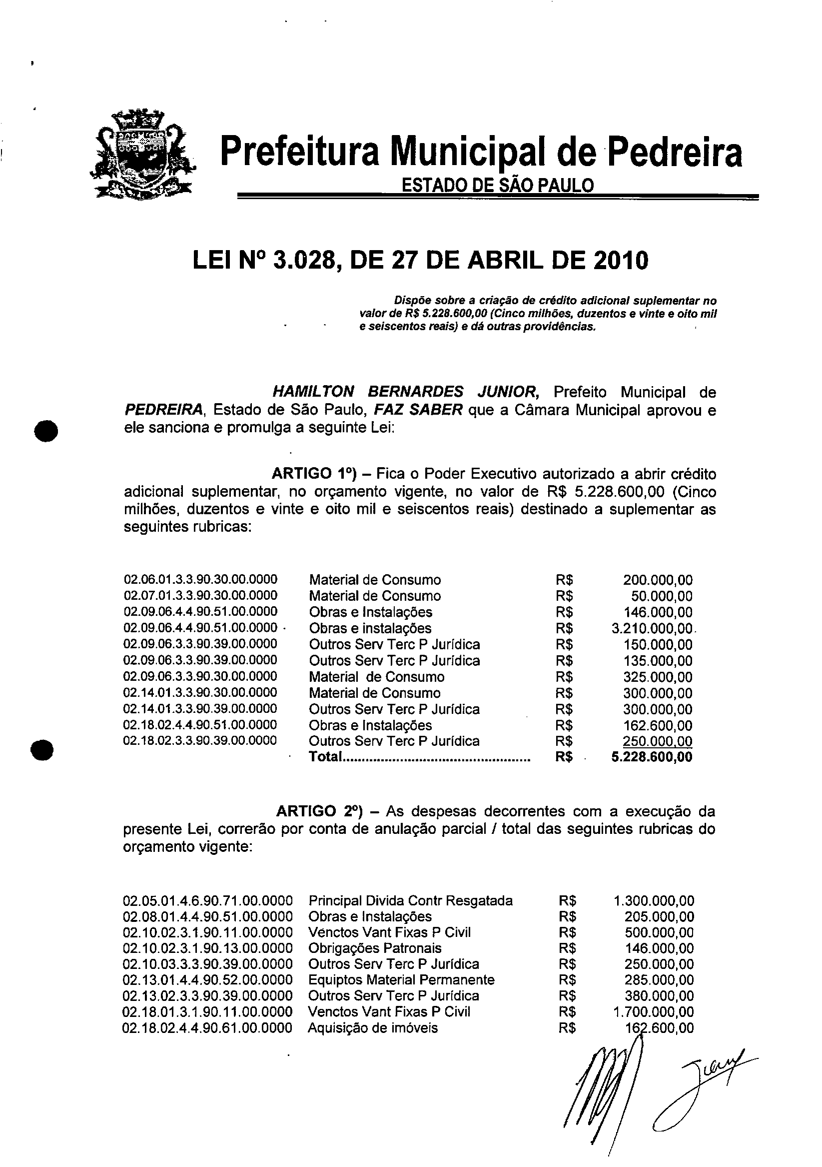 Lei Municipal - N° 3028 de 27/04/2010
