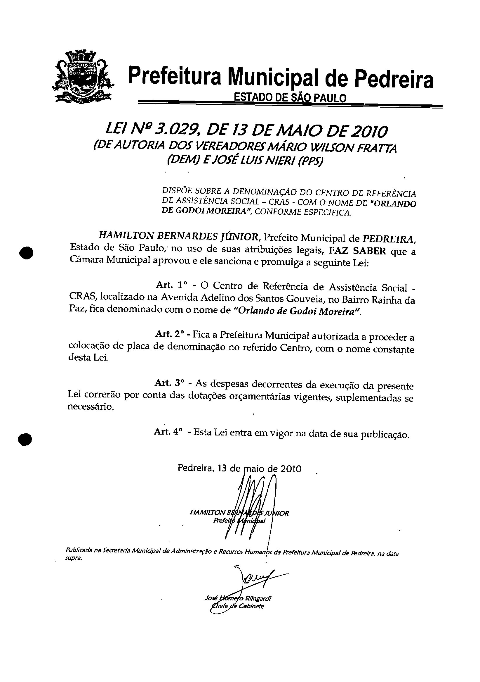 Ementa: DISPOE SOBRE A DENOMINAÇÃO DO CENTRO DE REFERÊNCIA DE ASSISTÊNCIA SOCIAL -CRAS -COM O NOME DE "ORLANDO DE GODOI MOREIRA", CONFORME ESPECIFICA.