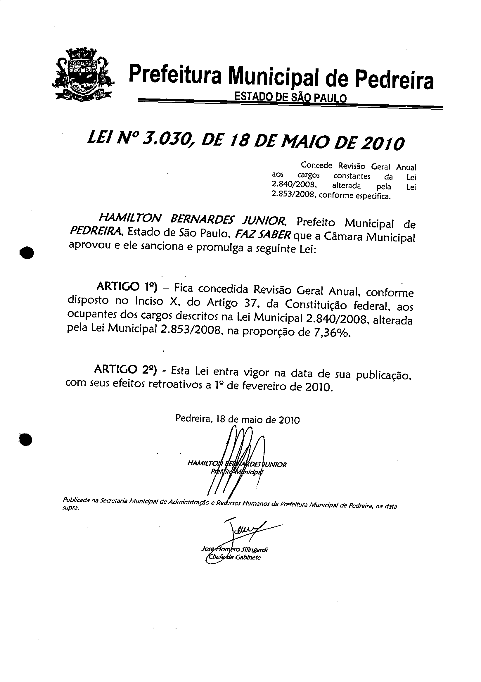 Lei Municipal - N° 3030 de 18/05/2010