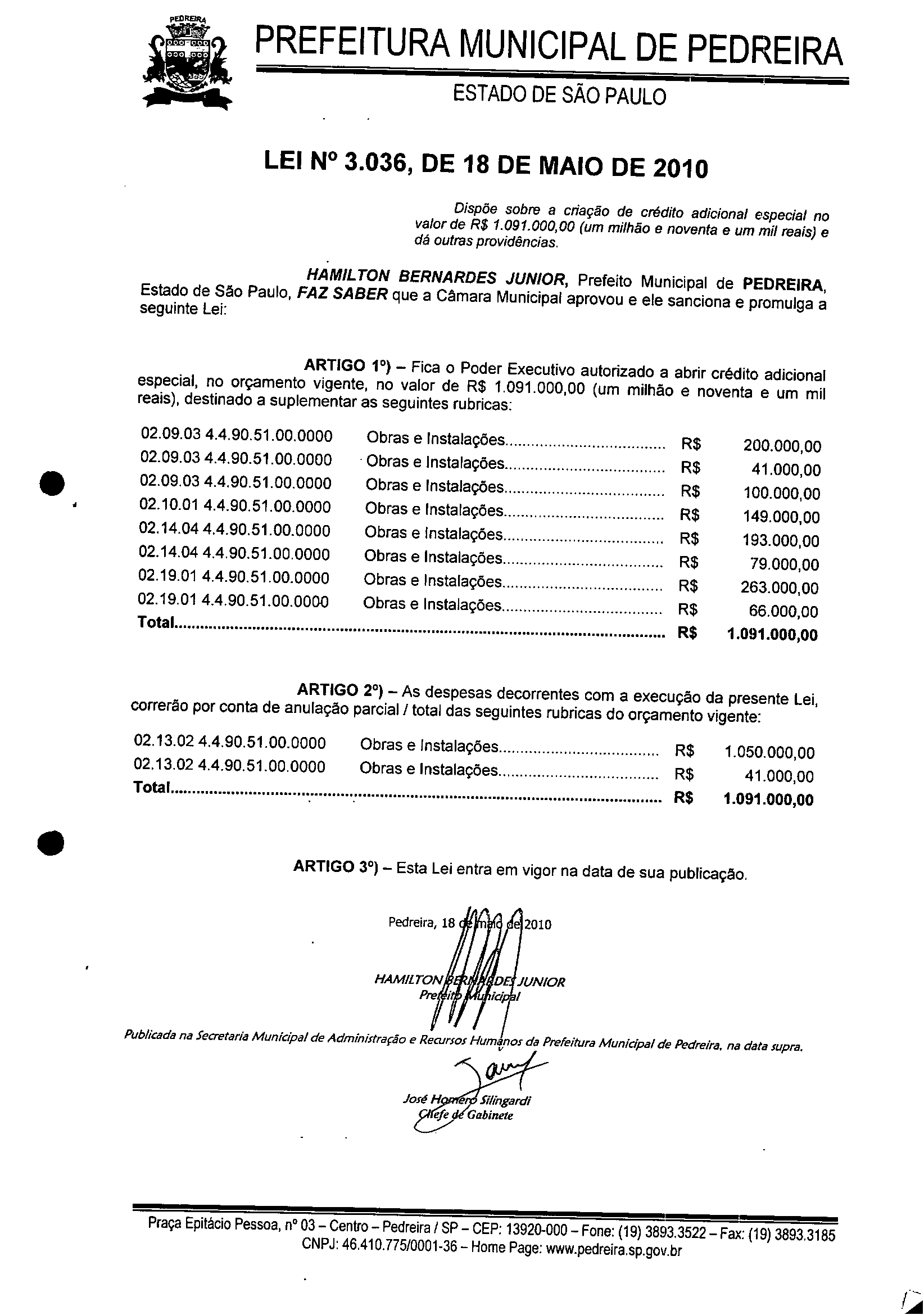 Ementa: Dispõe sobre a criação de crédito adicional especial no valor de R$ 1.091.000,00 (um milhão e noventa e um mil reais) e dá outras providências.