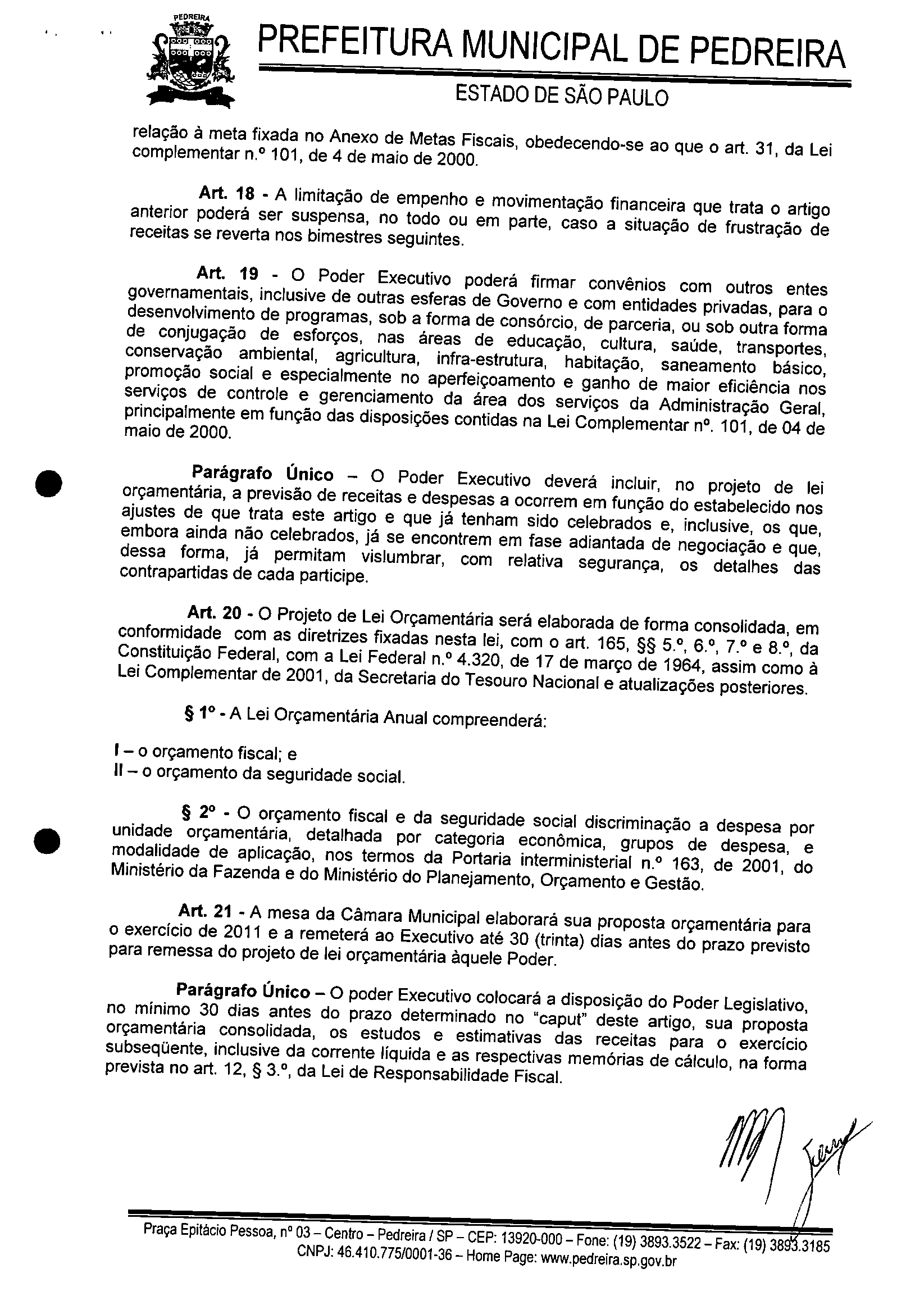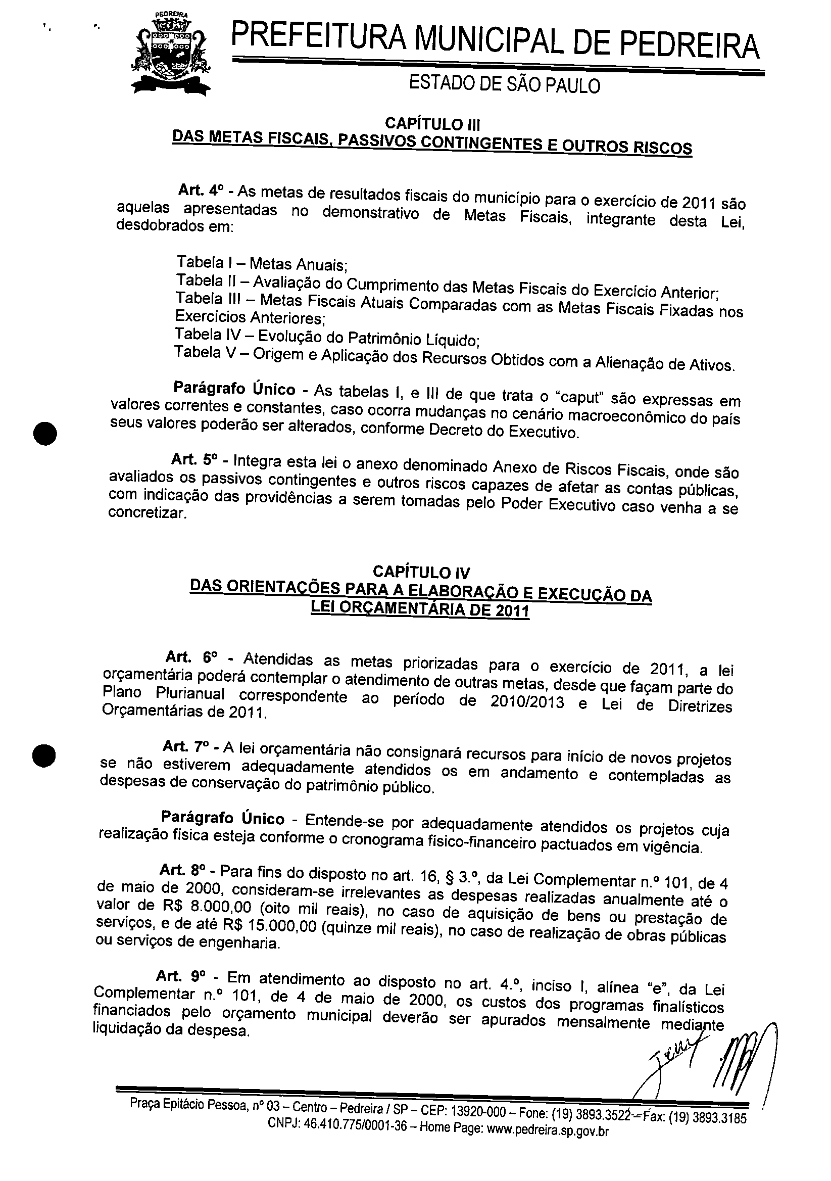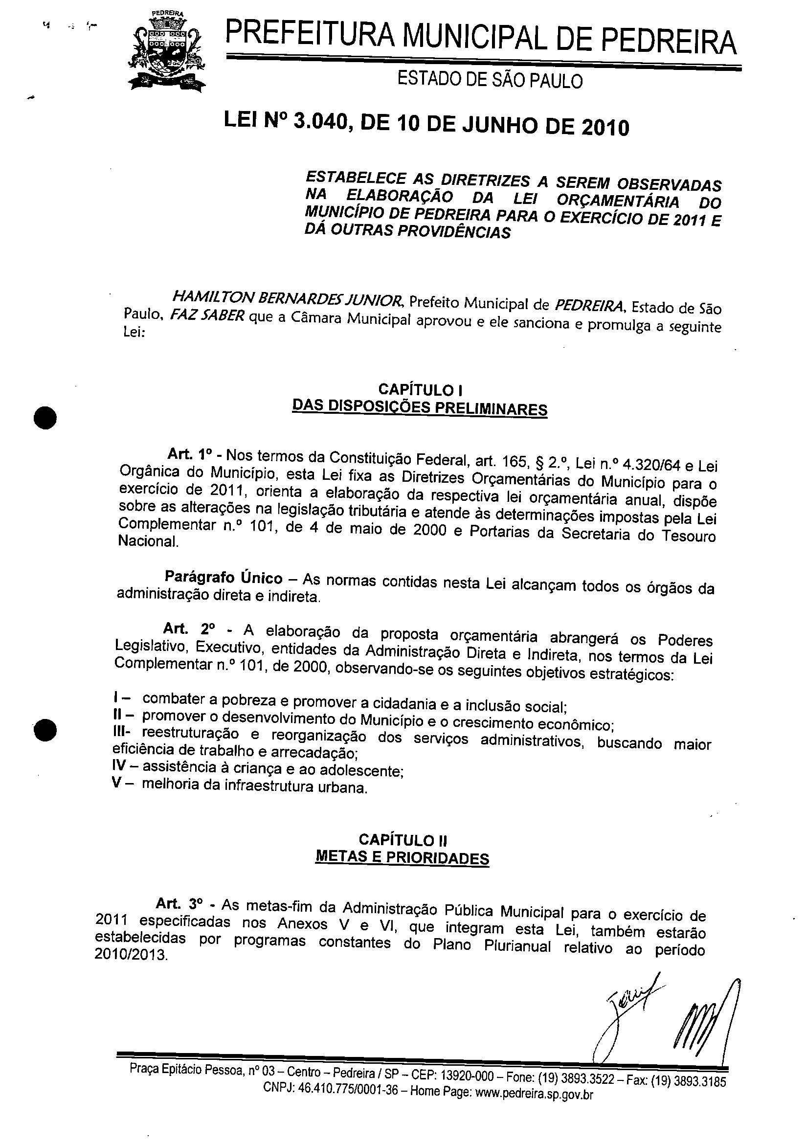 Ementa: ESTABELECE AS DIRETRIZES A SEREM OBSERVADAS NA ELABORAÇÃO DA LEI ORÇAMENTÁRIA DO MUNICíPIO DE PEDREIRA PARA O EXERCíCIO DE 2011 E DÁ OUTRAS PROVIDÊNCIAS