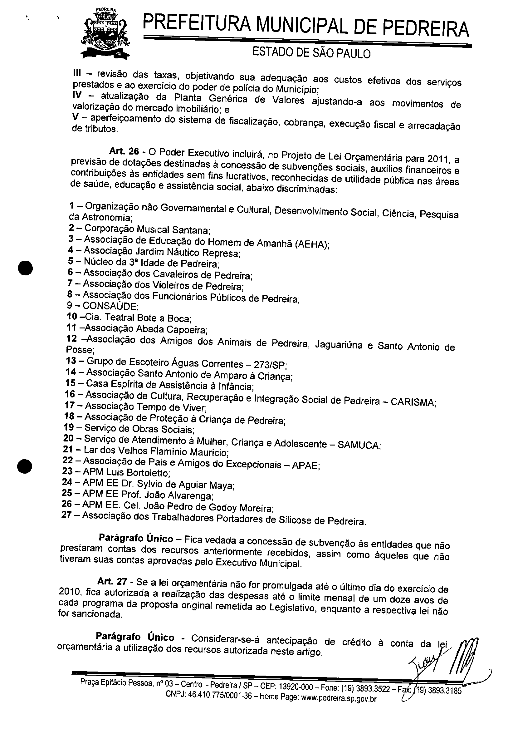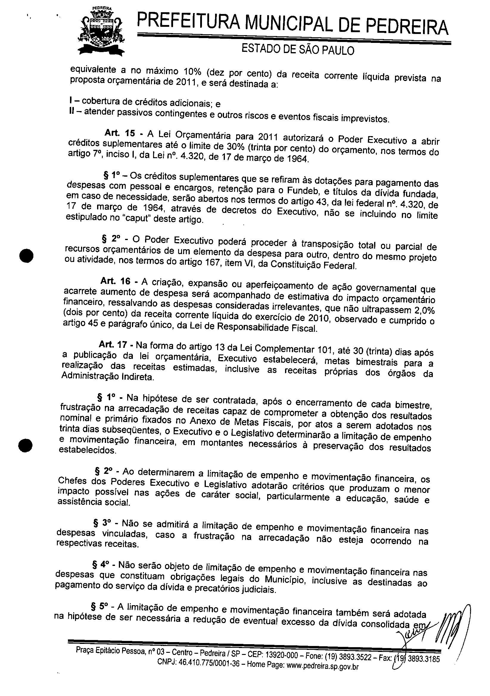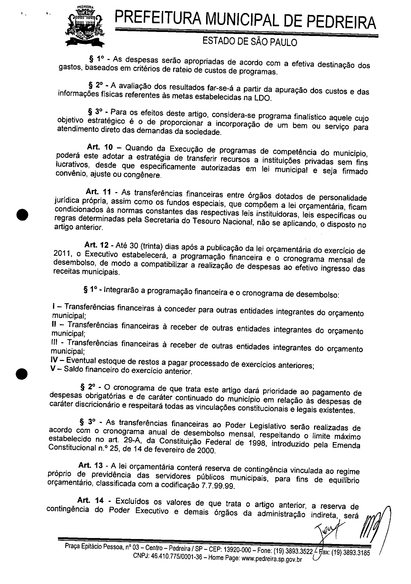 Ementa: ESTABELECE AS DIRETRIZES A SEREM OBSERVADAS NA ELABORAÇÃO DA LEI ORÇAMENTÁRIA DO MUNICíPIO DE PEDREIRA PARA O EXERCíCIO DE 2011 E DÁ OUTRAS PROVIDÊNCIAS