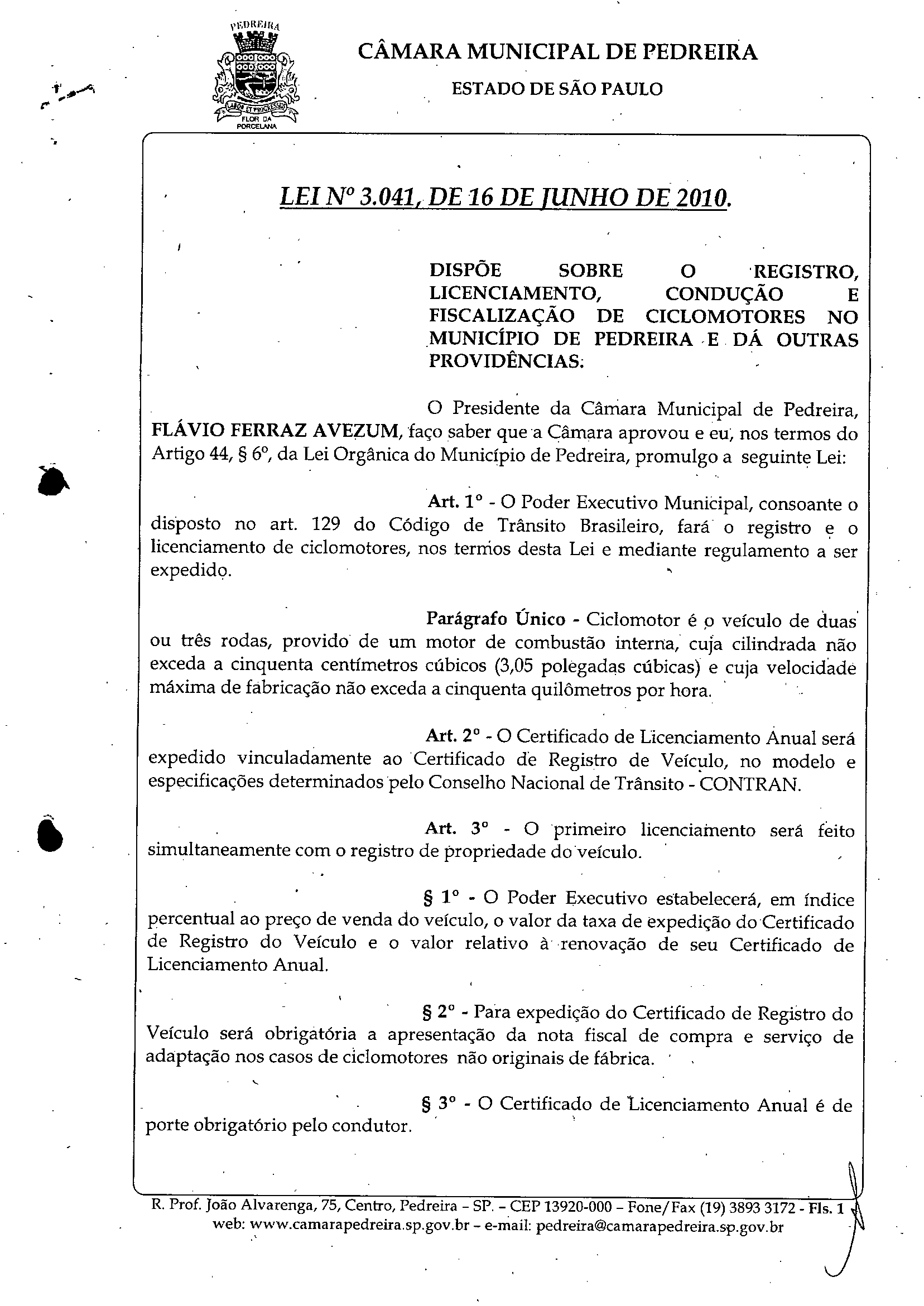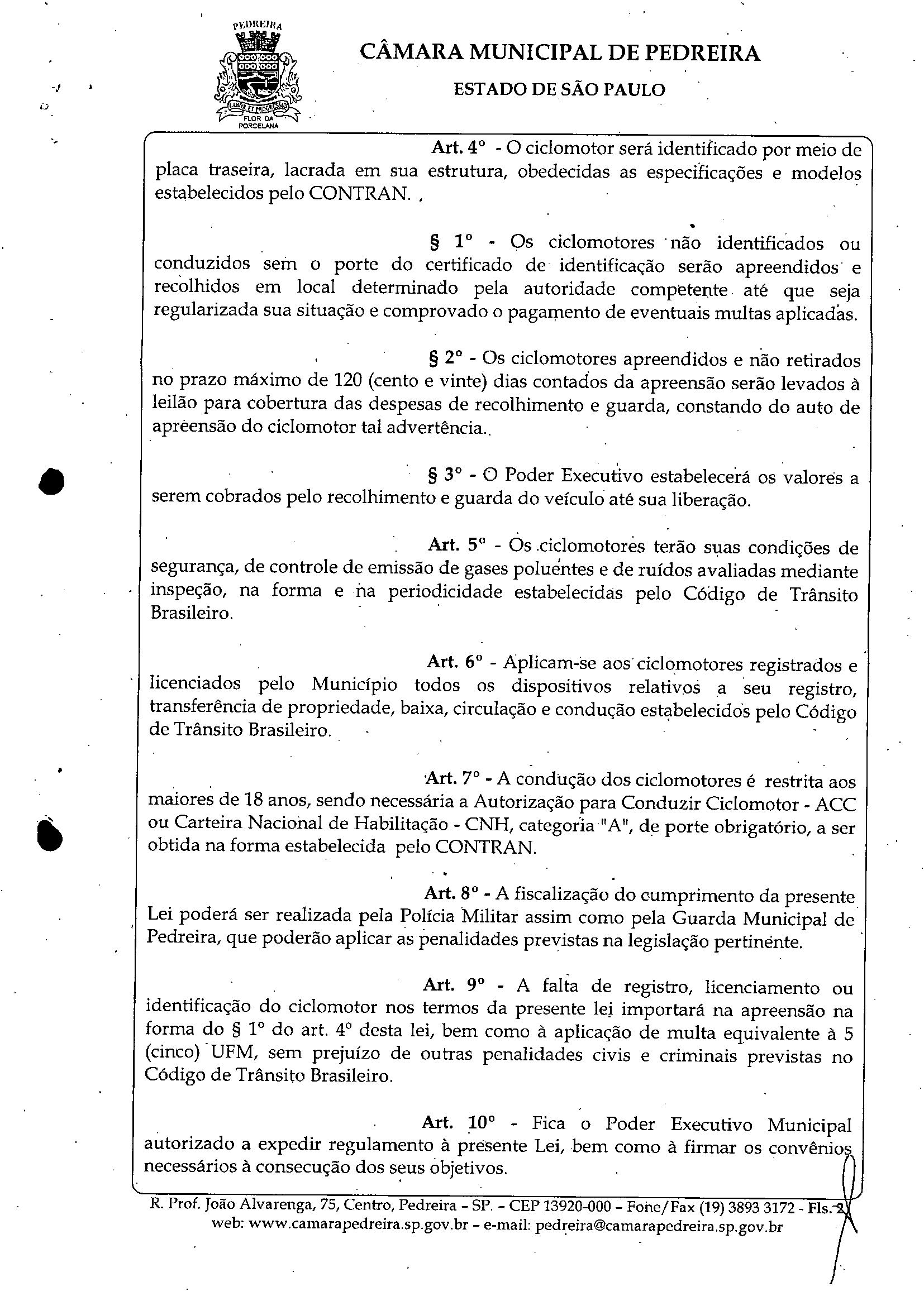 Ementa: DISPOE SOBRE O REGISTRO, LICENCIAMENTO, CONDUÇÃO E FISCALIZAÇÃO DE CICLOMOTORES NO MUNICÍPIO DE PEDREIRA E DÁ OUTRAS PROVIDÊNCIAS: