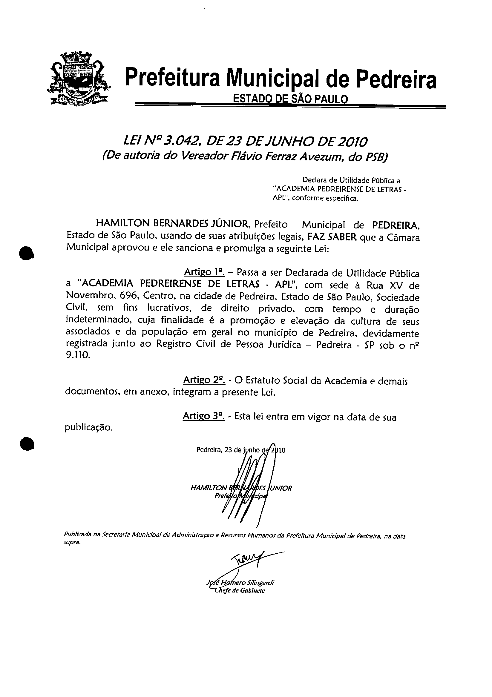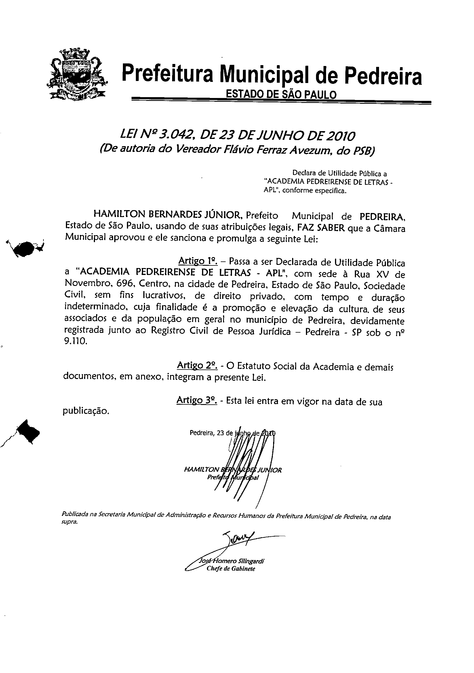 Ementa: Declara de Utilidade Pública a "ACADEMIA PEDREIRENSE DE LETRAS -APL", conforme especifica.