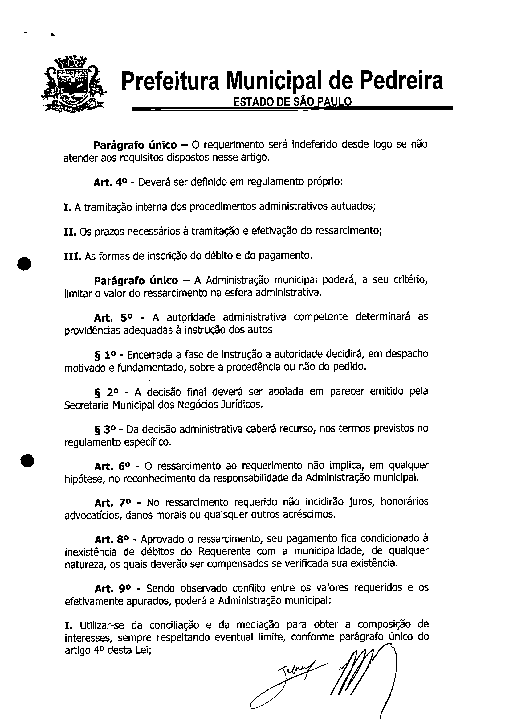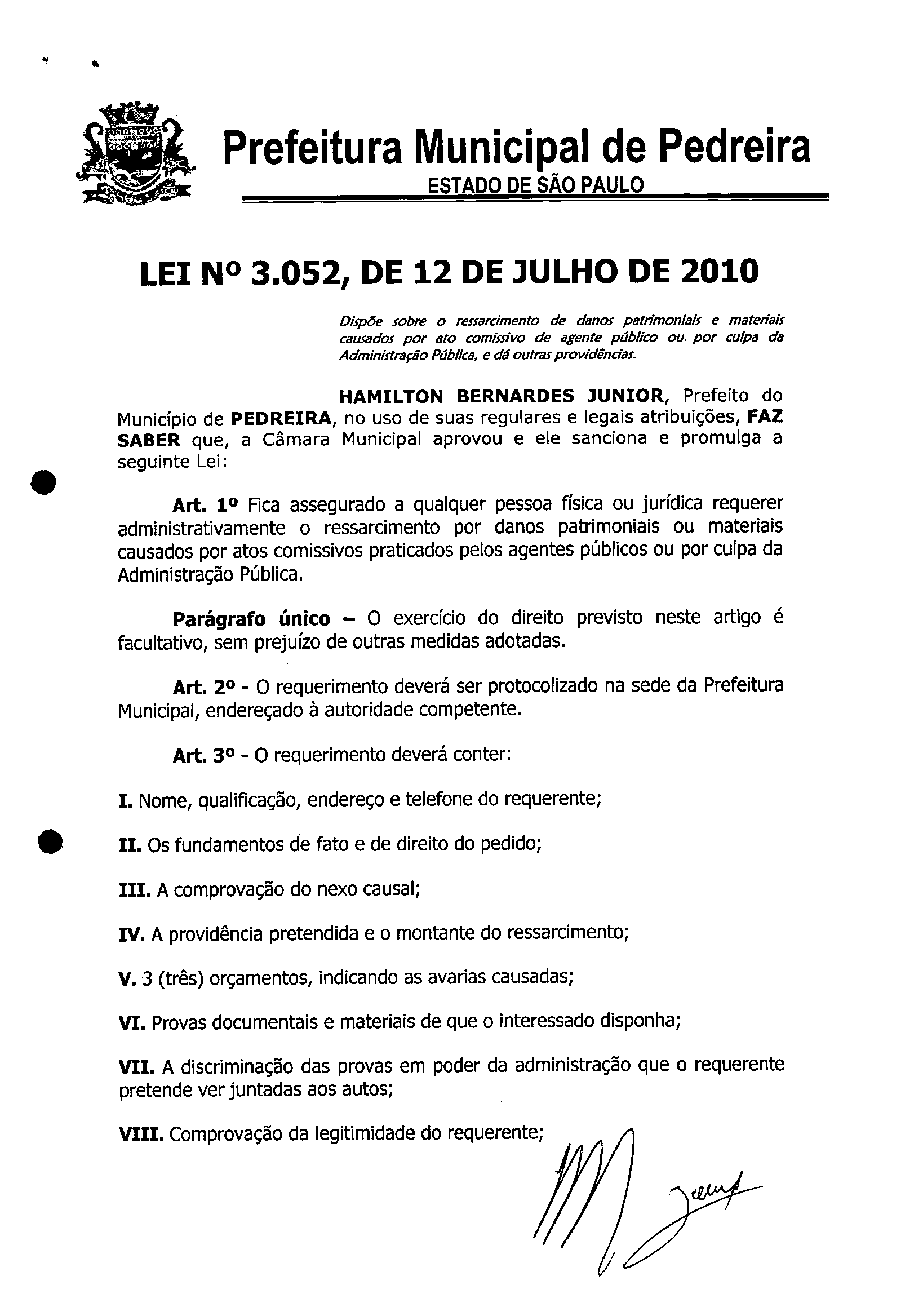 Ementa: Dispõe sobre o ressarcimento de danos patrimoniais e materiais causados por ato comissivo de agente ptlblico ou, por culpa da Administração Pública. e dá outras providências.