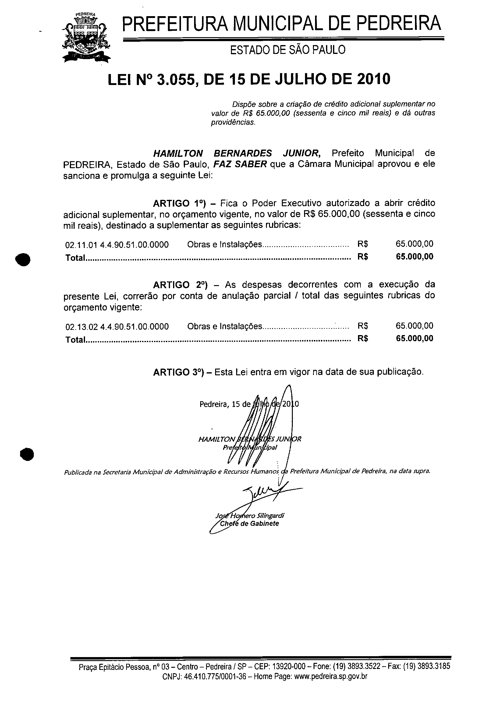 Ementa: Dispõe sobre a criação de crédito adicional suplementar no valor de R$ 65.000,00 (sessenta e cinco mil reais) e dá outras providências.